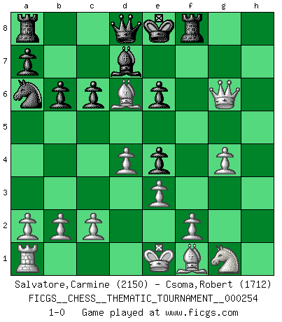 Last move : 1-0 2023 February 25 22:8:54 [Event "FICGS__CHESS__THEMATIC_TOURNAMENT__000254"] [Site "FICGS"] [Date "2023.01.19"] [Round "1"] [White "Salvatore,Carmine"] [Black "Csoma,Robert"] [Result "1-0"] [WhiteElo "2150"] [BlackElo "1712"] 1.d4 f5 2.Qd3 d5 3.g4 fxg4 4.Nc3 Nf6 5.Bg5 e6 6.h3 Be7 7.hxg4 g6 8.Qg3 Bd7 9.e3 Ne4 10.Nxe4 dxe4 11.Bf4 c6 12.Bc7 Qc8 13.Be5 Rf8 14.Rxh7 b6 15.Qh2 Na6 16.Rxe7+ Kxe7 17.Bd6+ Ke8 18.Qh7 Qd8 19.Qxg6+ 1-0 Follow this game move after move (download)White lost because he failed to remember the right continuation and had to think up the moves himself. (Siegbert Tarrasch) Kein Schachspieler kann gut schlafen. (H. G. Wells) La esencia del Ajedrez es pensar acerca de lo que el Ajedrez es. (David Bronstein) Le succès, c'est être capable d'aller d'échec en échec sans perdre son enthousiasme. (Winston Churchill) A married woman is like a fish riding a bicycle. (Rodolfo d'Ettorre)