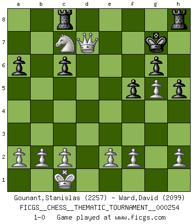 Last move : 1-0 2023 April 15 16:49:53 [Event "FICGS__CHESS__THEMATIC_TOURNAMENT__000254"] [Site "FICGS"] [Date "2023.01.19"] [Round "1"] [White "Gounant,Stanislas"] [Black "Ward,David"] [Result "1-0"] [WhiteElo "2257"] [BlackElo "2099"] 1.d4 f5 2.Qd3 d5 3.g4 g6 4.g5 Bg7 5.Nc3 Nc6 6.Nf3 Be6 7.Bf4 a6 8.Qe3 Bf7 9.Bg2 e6 10.Ne5 h5 11.Nxd5 Nge7 12.Nxf7 Kxf7 13.Nxc7 Nxd4 14.O-O-O Rc8 15.Rxd4 Bxd4 16.Qxe6+ Kg7 17.Rd1 Nc6 18.Bxc6 bxc6 19.Rxd4 Qxd4 20.Be5+ Qxe5 21.Qxe5+ Kh7 22.Qe7+ Kg8 23.Qe6+ Kg7 24.Qd7+ 1-0 Follow this game move after move (download)A big shock; the best chess player in history has passed away. (Lajos Portisch, about Bobby Fischer's death) In Buenos Aires ist es nicht mein vorrangiges Ziel ein starkes Turnier zu organisieren, sondern ein Turnier für Gentlemen. Ich würde nie Kamsky einladen. Ich mag keine Probleme. (Miguel Najdorf) Cada Peón es potencialmente una Reina. (James Mason) Les échecs, c'est la lutte contre l'erreur. (Johannes Zukertort) At last I discovered the true beauty of chess. So I proposed to her. (Dinesh De Silva)
