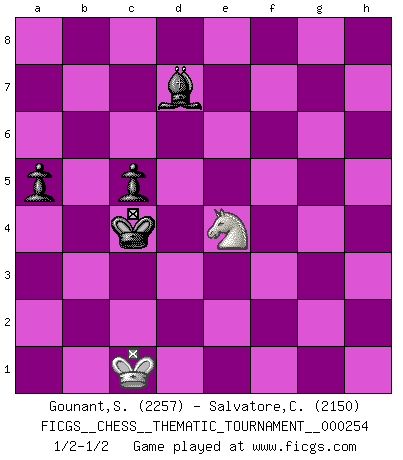 Last move : 1/2-1/2 2023 March 2 19:37:21 [Event "FICGS__CHESS__THEMATIC_TOURNAMENT__000254"] [Site "FICGS"] [Date "2023.01.19"] [Round "1"] [White "Gounant,Stanislas"] [Black "Salvatore,Carmine"] [Result "1/2-1/2"] [WhiteElo "2257"] [BlackElo "2150"] 1.d4 f5 2.Qd3 d5 3.g4 e5 4.dxe5 Nc6 5.g5 Nxe5 6.Qe3 Qe7 7.Nc3 c6 8.f4 Nc4 9.Qxe7+ Nxe7 10.Nf3 h6 11.h4 hxg5 12.Nxg5 Bd7 13.e4 fxe4 14.Bxc4 dxc4 15.Ncxe4 Nf5 16.Bd2 Rxh4 17.Rxh4 Nxh4 18.O-O-O Nf5 19.Ba5 b6 20.Bc3 c5 21.Be5 Bc6 22.Rg1 O-O-O 23.Ng3 Ne3 24.Ne6 Re8 25.Nxf8 Rxf8 26.Ne2 Ng2 27.Nc3 a6 28.b3 cxb3 29.axb3 g6 30.Rd1 Nxf4 31.Rd6 Kb7 32.Bxf4 Rxf4 33.Rxg6 Rd4 34.Rg7+ Rd7 35.Rxd7+ Bxd7 36.Nd1 b5 37.Nf2 Kc6 38.c3 Kd5 39.c4+ bxc4 40.bxc4+ Kxc4 41.Ne4 a5 1/2-1/2 Follow this game move after move (download)My God, Bobby Fischer plays so simply. (Alexei Suetin) Smyslow ist ein Beweis dafür, dass ich noch zehn Jahre spielen kann! [der 75 jährige über den 85 jährigen] (Viktor Kortschnoi) El Ajedrez detiene a su maestro dentro de sus propios vínculos, encadenando la mente y el cerebro, por lo que la libertad interior del mas fuerte debe sufrir. (Albert Einstein) Donnez-moi un Cavalier en 6e et je gagnerais toutes mes parties. (Steinitz) I've lost money so fast in these clubs it's left me reeling. I've read every poker book ever written, but the only way to get better at the game is to go out and play with people who are really good. The problem is, you stand to lose a lot of money doing it. (Matt Damon)
