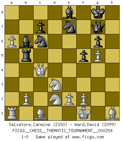 Last move : 1-0 2023 June 6 4:37:21 [Event "FICGS__CHESS__THEMATIC_TOURNAMENT__000254"] [Site "FICGS"] [Date "2023.01.19"] [Round "1"] [White "Salvatore,Carmine"] [Black "Ward,David"] [Result "1-0"] [WhiteElo "2150"] [BlackElo "2099"] 1.d4 f5 2.Qd3 d5 3.g4 g6 4.g5 h6 5.h4 Nc6 6.Bg2 Be6 7.c3 Bf7 8.Qb5 Qd7 9.Qxb7 Rb8 10.Qa6 Rb6 11.Qa4 e5 12.dxe5 Nxe5 13.Qxa7 Nc6 14.Qa4 Be7 15.Nf3 Kf8 16.Nbd2 hxg5 17.hxg5 Rxh1+ 18.Bxh1 Bd6 19.Qh4 Be8 20.a4 Qg7 21.a5 Rb5 22.a6 Bc5 23.Kf1 Ba7 24.Ne1 Nge7 25.Nd3 Kg8 26.Qf4 Bb6 27.c4 dxc4 28.Qxc4+ 1-0 Follow this game move after move (download)There's never before been a Chess player with such a thorough knowledge of the intricacies of the game and such an absolutely indomitable will to win. I think Bobby is the greatest player that ever lived. (Lisa Lane) Besser ein falscher Plan, logisch durchgeführt, als gar kein Plan. (Viktor Kortschnoi) Un juego de Ajedrez es un dialogo, una conversación entre un jugador y su oponente. Cada movimiento del oponente puede contener amenazas o tropiezos, pero un jugador no se puede defender de las amenazas o tomar ventaja de los tropiezos si es que no se pregunta a sí mismo: ¿Que es lo que mi oponente va a hacer después de cada movida?. (Bruce A. Moon) Il n'y a plus de joueurs du niveau de Jacob Murray dont la seule quête est le beau jeu, le plaisir de voir les pièces construire quelque chose. Sur 10 idées à la minute, 9 seront sans intérêt, la dernière s'avèrera géniale. (Christian Bauer) Players are not good because they find tactics, it is about the way to find the positions in which those tactics are hidden. (Luc-Olivier Leclerc)