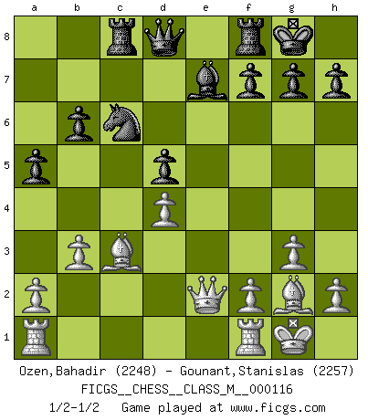 Last move : 1/2-1/2 2023 February 1 13:54:59 [Event "FICGS__CHESS__CLASS_M__000116"] [Site "FICGS"] [Date "2023.01.22"] [Round "1"] [White "Ozen,Bahadir"] [Black "Gounant,Stanislas"] [Result "1/2-1/2"] [WhiteElo "2248"] [BlackElo "2257"] 1.d4 Nf6 2.c4 e6 3.Nf3 d5 4.g3 Bb4+ 5.Bd2 a5 6.Qc2 O-O 7.Bg2 Be7 8.O-O Nbd7 9.b3 b6 10.Ne5 Bb7 11.cxd5 Nxd5 12.Nc6 Bxc6 13.Qxc6 Rc8 14.e3 Nb8 15.Qb5 c6 16.Qe2 c5 17.Nc3 cxd4 18.Nxd5 exd5 19.exd4 Nc6 20.Bc3 1/2-1/2 Follow this game move after move (download)Who is your opponent tonight, tonight I am playing against the Black pieces. (Akiba Rubinstein) Fallen sollten polizeilich verboten werden. (Savielly Grigorievitsch Tartakower) En partidas rápidas, el Caballo es mas poderoso que el Alfil. (Vlastimil Hort) Les échecs sont plus proches de l'art de l'assassinat que de l'art de la guerre. (Arturo Perez-Reverte) O divine art of subtlety and secrecy! Through you we learn to be invisible, through you inaudible and hence we can hold the enemy's fate in our hands. (Sun Tzu)