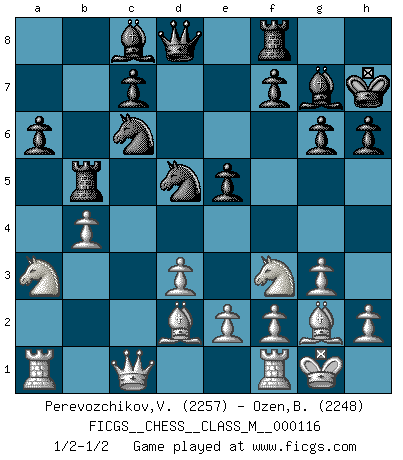 Last move : 1/2-1/2 2023 January 31 12:25:49 [Event "FICGS__CHESS__CLASS_M__000116"] [Site "FICGS"] [Date "2023.01.22"] [Round "1"] [White "Perevozchikov,Vjacheslav"] [Black "Ozen,Bahadir"] [Result "1/2-1/2"] [WhiteElo "2257"] [BlackElo "2248"] 1.Nf3 d5 2.g3 g6 3.c4 dxc4 4.Na3 Bg7 5.Nxc4 Nc6 6.d3 e5 7.Bd2 Nge7 8.b4 b5 9.Ne3 O-O 10.Bg2 h6 11.a4 Rb8 12.axb5 Rxb5 13.O-O a6 14.Nc2 Nd5 15.Qc1 Kh7 16.Na3 Rb6 17.Nc4 Rb5 18.Na3 Rb6 19.Nc4 Rb5 20.Na3 1/2-1/2 Follow this game move after move (download)A strong memory, concentration, imagination, and a strong will is required to become a great Chess player. (Bobby Fischer) Frage: Gibt es etwas was Sie mehr lieben als Autobahnen ohne Tempobegrenzungen? - Antwort: Deutsche Frauen ohne Tempobegrenzungen. (Loek van Wely) Un entendimiento a fondo de las continuaciones típicas del mate, hace de las combinaciones de sacrificio mas complicadas conducirlas a ellas no solo sin dificultad, sino casi de una manera natural. (Siegbert Tarrasch) Les Echecs mettent en conflit, non pas deux intelligences, mais deux volontés. (Lasker) Memory is a way of holding onto the things you love, the things you are, the things you never want to lose. (from the television show: The Wonder Years)