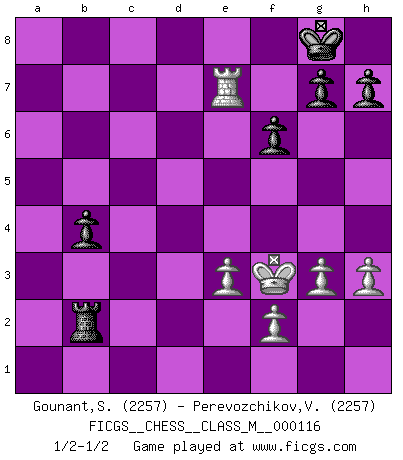 Last move : 1/2-1/2 2023 February 20 20:43:14 [Event "FICGS__CHESS__CLASS_M__000116"] [Site "FICGS"] [Date "2023.01.22"] [Round "1"] [White "Gounant,Stanislas"] [Black "Perevozchikov,Vjacheslav"] [Result "1/2-1/2"] [WhiteElo "2257"] [BlackElo "2257"] 1.c4 e5 2.Nc3 Nf6 3.g3 c6 4.Nf3 e4 5.Nd4 Qb6 6.e3 d5 7.Bg2 Bg4 8.Qb3 Qxb3 9.axb3 Bc5 10.d3 exd3 11.cxd5 O-O 12.h3 Bd7 13.dxc6 Nxc6 14.Nxc6 Bxc6 15.Bxc6 bxc6 16.Ra6 Bb4 17.Bd2 Rfb8 18.Rxc6 Be7 19.Rc4 Rxb3 20.Na4 Nd5 21.O-O Nb6 22.Nxb6 axb6 23.Rc3 Rxb2 24.Rxd3 b5 25.Bc3 Rba2 26.Rc1 Rc8 27.Rb1 Rc2 28.Bd4 Rc1+ 29.Rxc1 Rxc1+ 30.Kg2 b4 31.Kf3 f6 32.Bb2 Rc2 33.Rd7 Rxb2 34.Rxe7 1/2-1/2 Follow this game move after move (download)When you see a good move, look for a better one. (Emanuel Lasker) Mutter, ich bin eben Ex-Weltmeister geworden. --beim nach Hause Kommen nach dem Verlust des WM-Titels an Mihail Botvinnik -- (Mikhail Nekhemyevich Tal) Es el objetivo de la escuela moderna no tratar cada posición de acuerdo a una regla general, sino de acuerdo al principio inherente en la posición. (Richard Reti) Une platitude souvent récitée à propos des Echecs est qu'une des choses les plus difficiles à réaliser est de gagner une position gagnante. Cela ne manque pas de sens mais, pour ma part, j'ai toujours trouvé plus difficile de gagner une position perdante. (Tim Krabbe) Luck never made a man wise. (Seneca, Letters to Lucilius)