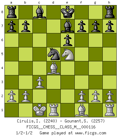 Last move : 1/2-1/2 2023 January 29 2:52:37 [Event "FICGS__CHESS__CLASS_M__000116"] [Site "FICGS"] [Date "2023.01.22"] [Round "1"] [White "Cirulis,Ilmars"] [Black "Gounant,Stanislas"] [Result "1/2-1/2"] [WhiteElo "2240"] [BlackElo "2257"] 1.e4 c5 2.c3 e6 3.Nf3 d5 4.exd5 Qxd5 5.d4 Nc6 6.Be3 Nf6 7.Na3 cxd4 8.Nb5 Qd7 9.Nbxd4 Be7 10.Nxc6 Qxc6 11.Ne5 Qe4 12.Qd4 Qxd4 13.Bxd4 Nd5 14.O-O-O 1/2-1/2 Follow this game move after move (download)The King is a fighting piece. Use it ! (Wilhelm Steinitz) Matt entspricht nicht immer den Tatsachen. (Savielly Grigorievitsch Tartakower) Cada Peón es potencialmente una Reina. (James Mason) La tactique est l'élément le plus important du milieu de jeu. (Siegbert Tarrasch) In every real man a child is hidden that wants to play. (Friedrich Nietzsche)