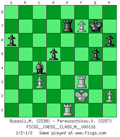 Last move : 1/2-1/2 2023 February 27 17:27:47 [Event "FICGS__CHESS__CLASS_M__000116"] [Site "FICGS"] [Date "2023.01.22"] [Round "1"] [White "Bussoli,Marco"] [Black "Perevozchikov,Vjacheslav"] [Result "1/2-1/2"] [WhiteElo "2238"] [BlackElo "2257"] 1.d4 e6 2.e4 d5 3.Nc3 Nf6 4.e5 Nfd7 5.f4 c5 6.Nf3 Nc6 7.Be3 cxd4 8.Nxd4 Qb6 9.Qd2 Qxb2 10.Rb1 Qa3 11.Bb5 Nxd4 12.Bxd4 a6 13.Bxd7+ Bxd7 14.Rb3 Qe7 15.Rxb7 Rc8 16.f5 exf5 17.O-O Qd8 18.Rfb1 Qa5 19.Qg5 Be6 20.Ne2 h6 21.Qg3 g5 22.c3 f4 23.Qf3 Bg7 24.g3 fxg3 25.Nxg3 O-O 26.Nh5 Rc7 27.R7b6 Qxa2 28.Qd1 Bf5 29.Ra1 Qc4 30.Nxg7 Kxg7 31.Rf6 Qd3 32.e6 Kh7 33.Qxd3 Bxd3 34.Be5 Rb7 35.Bd6 Kg7 36.Rf3 Bc4 37.Bxf8+ Kxf8 38.Re1 Re7 39.Kf2 Kg7 40.exf7 1/2-1/2 Follow this game move after move (download)I feel as if I were a piece in a game of Chess, when my opponent says of it: That piece cannot be moved. (Soren Kierkegaard) Viele Opfer benötigen überhaupt keine konkrete Berechnung. Es genügt sich die entstehende Position kurz vorzustellen, um uns davon zu überzeugen, dass das Opfer korrekt ist. (Mikhail Nekhemyevich Tal) Si pudieramos observar el interior de la cabeza de un jugador de Ajedrez, encontraríamos ahí un mundo lleno de sentimientos, imágenes, ideas, emoción y pasión. (Alfred Binet) Les échecs sont un jeu par leur forme, un art par leur essence et une science par sa difficulté d'acquisition. Ils peuvent vous procurer autant de plaisir qu'un bon livre ou une belle musique, mais vous n'aurez une réelle joie que si vous arrivez à bien jouer. (Tigran Petrosian) Don't be discouraged. It's often the last key in the bunch that opens the lock. (Author unknown)