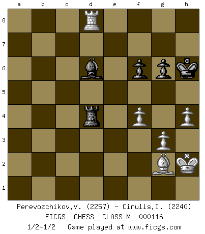 Last move : 1/2-1/2 2023 March 23 6:5:31 [Event "FICGS__CHESS__CLASS_M__000116"] [Site "FICGS"] [Date "2023.01.22"] [Round "1"] [White "Perevozchikov,Vjacheslav"] [Black "Cirulis,Ilmars"] [Result "1/2-1/2"] [WhiteElo "2257"] [BlackElo "2240"] 1.Nf3 d5 2.g3 h5 3.Bg2 h4 4.Nxh4 e5 5.c4 d4 6.d3 Nc6 7.Nf3 a5 8.a3 Be7 9.e3 Nf6 10.exd4 Nxd4 11.Nc3 Bg4 12.h3 Bxf3 13.Bxf3 c6 14.Bg2 Ne6 15.O-O Nc5 16.Qe2 Qxd3 17.Qxe5 Qxc4 18.Qc7 Qe6 19.Be3 Rc8 20.Qb6 Nfd7 21.Qa7 O-O 22.Bxc5 Bxc5 23.Qxb7 Ne5 24.Qa6 Qc4 25.Qxc4 Nxc4 26.Ne4 Bd4 27.Rac1 Nxb2 28.Nd6 Rb8 29.Rxc6 Rb6 30.Nc8 Rxc6 31.Ne7+ Kh7 32.Nxc6 Bc5 33.Nxa5 Bxa3 34.Ra1 Bc5 35.Rb1 Ba3 36.Nc6 g6 37.Ne5 Kg7 38.Bd5 f6 39.Nc6 Kh6 40.Bg2 Rc8 41.h4 Rc7 42.Nd4 Na4 43.Rb8 Rd7 44.Ne6 Nc5 45.Nf4 Rd1+ 46.Kh2 Nd3 47.Nxd3 Rxd3 48.f4 Bd6 49.Rd8 Rd4 1/2-1/2 Follow this game move after move (download)Chess is a sea in which a gnat may drink and an elephant may bathe. (Hindu proverb) Über Frauen: Chess is better. (Robert James Fischer) Bobby Fischer es el mas grande genio de Ajedrez de todos los tiempos. (Alexander Kotov) Il (Jacob Murray) ne joue pas pour le bon coup, mais pour le meilleur. (Eloi Relange) If you don't practice you don't deserve to win. (Andre Agassi)