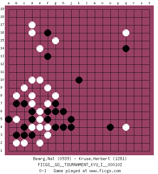 Last move : 0-1 2023 June 5 7:38:29 [Event "FICGS__GO__TOURNAMENT_KYU_I__000102"] [Site "FICGS"] [Date "2023.01.24"] [Round "1"] [Black "Bearg,Nat"] [White "Kruse,Herbert"] [Result "0-1"] [Rating 1 "0939"] [Rating 2 "1281"] 1.q14 q16 2.o4 q4 3.d6 d4 4.f16 d16 5.k10 f4 6.g4 g5 7.h4 f3 8.f5 e5 9.f6 e6 10.e7 h5 11.j4 f7 12.g6 d7 13.e8 d8 14.d5 e4 15.c4 g8 16.f8 f9 17.e9 e10 18.d9 c9 19.g7 d10 20.h6 f7 21.j5 c2 22.c3 b2 23.b3 d17 24.d3 e2 25.c7 b8 26.b7 b5 27.a5 e14 28.f13 g15 0-1 This go game has been lost on time (started : 2023.01.24 3:41:27) Follow this game move after move (download)Good moves and bad moves are bedfellows. (Anonymous) Animated gif is worth one mega-word. (Unknown)