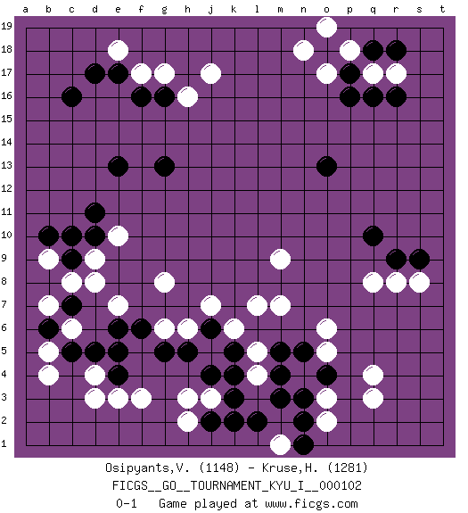 Last move : 0-1 2023 May 7 23:56:28 [Event "FICGS__GO__TOURNAMENT_KYU_I__000102"] [Site "FICGS"] [Date "2023.01.24"] [Round "1"] [Black "Osipyants,Vladimir"] [White "Kruse,Herbert"] [Result "0-1"] [Rating 1 "1148"] [Rating 2 "1281"] 1.q16 d4 2.c16 q4 3.e17 r17 4.r16 q17 5.p17 p18 6.o18 o17 7.p16 n18 8.q18 o19 9.r18 f3 10.d10 c8 11.c9 d8 12.e13 e10 13.d11 o3 14.k4 f17 15.f16 g17 16.g16 e18 17.d17 j17 18.q10 r8 19.r9 q8 20.s9 k6 21.m3 j3 22.j4 h3 23.k3 h6 24.m5 n4 25.m4 m7 26.n2 o2 27.j2 h2 28.k2 s8 29.o13 b9 30.b10 d9 31.c10 h16 32.g13 o6 33.n3 l5 34.l2 m1 35.n1 l4 36.o4 o5 37.n5 q3 38.j6 j7 39.k5 l7 40.h5 g6 41.g5 d3 42.f6 g8 43.e5 e7 44.d5 b5 45.b6 c6 46.c5 b4 47.e4 e3 48.e6 m9 49.c7 b7 0-1 Follow this game move after move (download)While the Baroque rules of chess could only have been created by humans, the rules of go are so elegant, organic, and rigorously logical that if intelligent life forms exist elsewhere in the universe, they almost certainly play go. (Edward Lasker, international chess master) God, you are such an idiot. - Actually, I thought I was more of a jerk. (Gregory House to Stacy Warner, House M.D.)