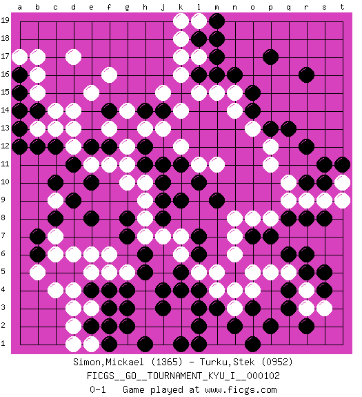 Last move : 0-1 2023 August 18 22:13:59 [Event "FICGS__GO__TOURNAMENT_KYU_I__000102"] [Site "FICGS"] [Date "2023.01.24"] [Round "1"] [Black "Simon,Mickael"] [White "Turku,Stek"] [Result "0-1"] [Rating 1 "1365"] [Rating 2 "0952"] 1.r16 c4 2.q3 d17 3.p17 d14 4.e4 e3 5.f3 d3 6.f4 c6 7.k4 q5 8.q8 r3 9.r2 r4 10.p2 o5 11.c12 c9 12.e12 k16 13.f14 f16 14.m17 l17 15.m16 q10 16.r12 p11 17.r10 r9 18.s10 q9 19.b14 c13 20.b12 b13 21.a13 d12 22.d11 d13 23.c10 e15 24.d9 n4 25.m3 h2 26.f2 o2 27.o3 n3 28.n2 o4 29.o1 k3 30.r8 s9 31.s8 t10 32.r6 p8 33.p7 o8 34.s5 n7 35.s4 s3 36.j4 m4 37.l3 h4 38.h5 g5 39.g4 h3 40.h6 f6 41.e2 d2 42.c8 e11 43.e10 f11 44.f12 g11 45.h12 g12 46.g13 h13 47.h14 j13 48.h11 g10 49.j14 k14 50.j10 h10 51.k11 k12 52.j11 j15 53.g8 h9 54.j8 f13 55.j9 g14 56.e8 e6 57.d5 d6 58.b7 k2 59.j3 j2 60.g7 d4 61.c5 b5 62.g2 g1 63.h1 j1 64.l2 e5 65.f1 d1 66.l1 e1 67.k1 f5 68.h1 h8 69.g3 j7 70.m9 l11 71.l7 k6 72.l6 l5 73.l10 m11 74.k5 h7 75.p13 n14 76.o15 o13 77.s11 p12 78.q13 b15 79.l18 k18 80.m18 l19 81.m19 k19 82.a15 b16 83.a16 a17 84.a14 c14 85.a12 b17 86.t11 t9 87.q6 p5 88.o7 n8 89.r5 n6 90.q4 l15 91.o14 n15 92.n16 m15 93.b6 c7 94.l16 k17 95.l4 m5 96.k9 k7 0-1 Comment by player 2 : Stek Turku : thank you too Follow this game move after move (download)Avoid the plate connection. (Anonymous) Nobody is always a winner, and anybody who says he is, is either a liar or doesn't play poker. (Amarillo Slim)