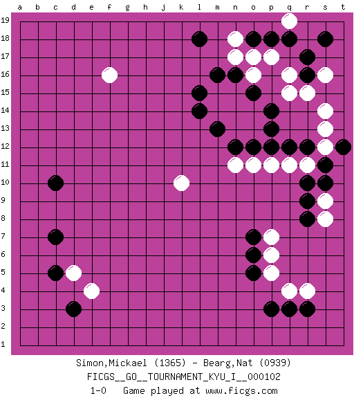 Last move : 1-0 2023 May 16 0:15:1 [Event "FICGS__GO__TOURNAMENT_KYU_I__000102"] [Site "FICGS"] [Date "2023.01.24"] [Round "1"] [Black "Simon,Mickael"] [White "Bearg,Nat"] [Result "1-0"] [Rating 1 "1365"] [Rating 2 "0939"] 1.r16 d5 2.q3 f16 3.q12 k10 4.c7 q4 5.p3 q16 6.r17 q15 7.p18 p17 8.o18 o17 9.c10 n18 10.q18 r15 11.d3 e4 12.c5 q11 13.p12 p11 14.o12 o11 15.n12 n11 16.o5 p5 17.o6 p6 18.o15 o14 19.n14 o13 20.p14 m14 21.m13 n15 22.n16 n13 23.p13 n14 24.l14 m15 25.m16 o16 26.l15 n17 27.l18 s16 28.s18 q19 29.r3 r4 30.o7 p7 31.r12 s12 32.s11 s13 33.t12 r11 34.s10 s9 35.r9 s8 36.r10 s14 37.r8 1-0 This go game has been lost on time (started : 2023.01.24 3:41:27) Follow this game move after move (download)At the head of two stones in a row, play hane. (Anonymous) Kids, you tried your best and you failed miserably. The lesson is, never try. (Simpsons)