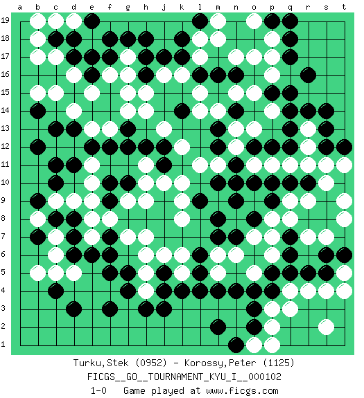 Last move : 1-0 2023 September 24 22:7:21 [Event "FICGS__GO__TOURNAMENT_KYU_I__000102"] [Site "FICGS"] [Date "2023.01.24"] [Round "1"] [Black "Turku,Stek"] [White "Korossy,Peter"] [Result "1-0"] [Rating 1 "0952"] [Rating 2 "1125"] 1.r16 p17 2.q17 p16 3.r14 l17 4.d17 r4 5.d3 c5 6.c4 d5 7.f3 d9 8.p4 p3 9.o3 q3 10.n4 r7 11.j3 c15 12.d13 e15 13.f17 g15 14.h17 j16 15.g13 e13 16.e12 f13 17.f12 d12 18.d11 c12 19.c11 e11 20.g12 e10 21.b7 b5 22.d7 e7 23.e6 c7 24.c8 c6 25.d8 e8 26.d6 b8 27.b9 b17 28.c13 h7 29.f5 k10 30.b12 j13 31.k18 l18 32.k17 k16 33.l16 n17 34.m16 p14 35.l19 m18 36.n16 o17 37.n14 o13 38.m12 o11 39.m10 k8 40.m8 o5 41.o4 m6 42.p10 q11 43.n10 r9 44.o8 l14 45.p12 p11 46.o12 n13 47.m13 m14 48.q12 n12 49.n11 n15 50.q10 r11 51.r10 r12 52.q13 r13 53.q14 s10 54.s9 s11 55.r8 q9 56.s8 q8 57.q7 p7 58.q6 p8 59.p9 o7 60.n7 n6 61.p5 o9 62.o10 s7 63.o6 n8 64.m7 t8 65.n9 t9 66.o8 p6 67.l4 h5 68.g4 k5 69.r5 s4 70.s5 s2 71.c18 b18 72.s14 l11 73.o2 p2 74.f9 e9 75.f7 f8 76.g10 g9 77.f10 h9 78.q18 p18 79.p19 o19 80.q19 m19 81.h18 m11 82.j11 k12 83.k4 g7 84.f6 h14 85.l5 k6 86.l6 h4 87.h3 o1 88.n1 p1 89.m2 b19 90.b14 c17 91.d18 d16 92.e16 f16 93.e17 g16 94.j17 g17 95.g18 b15 96.p15 o15 97.q15 c19 98.e19 d19 99.f18 d14 100.h16 h15 101.l9 k9 102.k14 l15 103.t12 t11 104.s13 g14 105.j5 j6 106.j4 q4 107.q5 t5 108.t6 t4 109.s6 c9 110.c10 j10 111.g5 h6 112.j12 h11 113.h12 h10 114.s12 m5 115.m4 1-0 Comment by player 1 : Stek Turku : than you too Follow this game move after move (download)A meijin needs no joseki. (Anonymous) Life is like a ten-speed bicycle: most of us have gears we never use. (Charles M. Schulz)