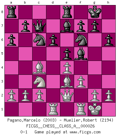 Last move : 0-1 2007 October 11 19:13:14 [Event "FICGS__CHESS__CLASS_A__000026"] [Site "FICGS"] [Date "2007.08.23"] [Round "1"] [White "Pagano,Marcelo"] [Black "Mueller,Robert"] [Result "0-1"] [WhiteElo "2003"] [BlackElo "2194"] 1.e4 c5 2.Nf3 d6 3.d4 cxd4 4.Nxd4 Nf6 5.Nc3 a6 6.Be3 Ng4 7.Bg5 h6 8.Bc1 Nf6 9.Bc4 e5 10.Nf3 Be7 11.O-O Qc7 12.Qe2 O-O 13.Nh4 Re8 14.Be3 Nc6 15.Rad1 Bg4 16.f3 Bd7 17.Nf5 Bxf5 0-1 Comment by player 1 : Marcelo Pagano : I wish to resign all my games in FICGS because I'm not satisfied with the level chess that i've have been played. So i'll wait you next move for resign! Kind regards! Sicilian : Najdorf, Byrne (English) attack Kingside Castling by player White (move 11) Kingside Castling by player Black (move 12) Player Black won this chess game. Follow this game move after move (download)One of these modest little moves may be more embarrassing to your opponent than the biggest threat. (Siegbert Tarrasch) Modernes Schach erfordert enorme Anspannung. Es ist für einen normalen Menschen unmöglich das auszuhalten. (Viktor Kortschnoi) Tu sabes, camarada Pachman, no disfruto el ser un Ministro, preferería jugar al Ajedrez como tu. (Che Guevara) En blitz, le Cavalier l'emporte sur le Fou. (Vlastimil Hort) Drag your thoughts away from your troubles... by the ears, by the heels, or any other way you can manage it. (Mark Twain)