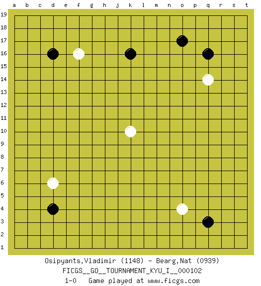 Last move : 1-0 2023 March 2 0:21:28 [Event "FICGS__GO__TOURNAMENT_KYU_I__000102"] [Site "FICGS"] [Date "2023.01.24"] [Round "1"] [Black "Osipyants,Vladimir"] [White "Bearg,Nat"] [Result "1-0"] [Rating 1 "1148"] [Rating 2 "0939"] 1.q16 d6 2.d4 o4 3.q3 f16 4.d16 q14 5.o17 k10 6.k16 1-0 This go game has been lost on time (started : 2023.01.24 3:41:27) Follow this game move after move (download)The carpenter's square becomes ko. (Anonymous) Life is the sum of all your choices. (Albert Camus)