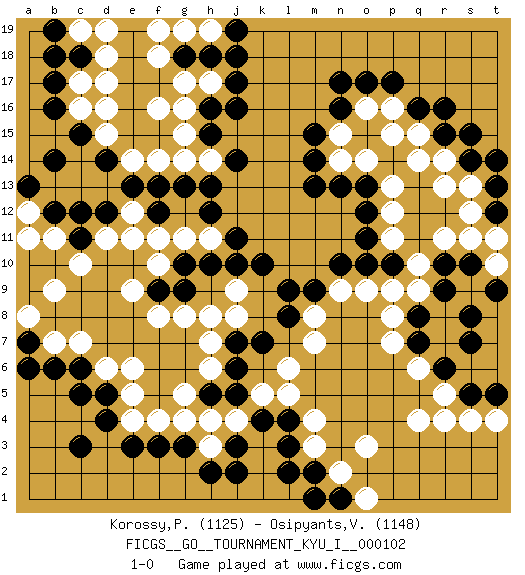 Last move : 1-0 2023 May 30 23:6:37 [Event "FICGS__GO__TOURNAMENT_KYU_I__000102"] [Site "FICGS"] [Date "2023.01.24"] [Round "1"] [Black "Korossy,Peter"] [White "Osipyants,Vladimir"] [Result "1-0"] [Rating 1 "1125"] [Rating 2 "1148"] 1.q16 q4 2.d4 d17 3.c15 f16 4.b17 c10 5.c12 c7 6.c5 d11 7.g3 o3 8.l3 q10 9.j16 h17 10.j17 f14 11.n17 r13 12.k10 p7 13.r15 f8 14.e13 e14 15.d14 d16 16.c18 d18 17.h13 f11 18.f13 g14 19.g13 h14 20.j14 h7 21.o10 p12 22.r6 r4 23.r9 q9 24.r10 r11 25.s5 s4 26.q8 p8 27.q7 o9 28.n10 n9 29.m9 m8 30.k7 l6 31.j6 m4 32.k4 g5 33.l8 m7 34.l9 o14 35.n13 n14 36.m13 o16 37.o17 p16 38.p17 q14 39.g10 f10 40.g9 g11 41.h10 h11 42.j11 g8 43.h18 g17 44.g18 f18 45.m15 n15 46.m14 q15 47.r16 f4 48.f3 e4 49.e3 d6 50.m2 n2 51.b6 b7 52.d5 e5 53.c3 m3 54.l2 r5 55.t5 t4 56.s7 q6 57.s8 h4 58.j3 b11 59.b12 a12 60.a13 a11 61.b14 h3 62.h2 j4 63.j2 j8 64.o12 p11 65.s14 s13 66.o13 p13 67.f9 e9 68.h16 g16 69.c6 j9 70.j10 h6 71.j7 g4 72.s10 s11 73.c11 b9 74.j5 c17 75.b18 c16 76.b16 d15 77.d12 e12 78.f12 e11 79.h15 g15 80.h12 g19 81.j19 l5 82.h5 e6 83.n16 p15 84.p10 p9 85.o11 k5 86.l4 r14 87.s15 c19 88.b19 d19 89.t12 t11 90.t13 s12 91.t14 t10 92.t9 f19 93.a7 a8 94.a6 h19 95.j18 h8 96.n1 o1 97.m1 1-0 Follow this game move after move (download)Do not make moves that strengthen your opponent ! (Anonymous) There is a computer disease that anybody who works with computers knows about. It's a very serious disease and it interferes completely with the work. The trouble with computers is that you 'play' with them ! (Richard P. Feynman)