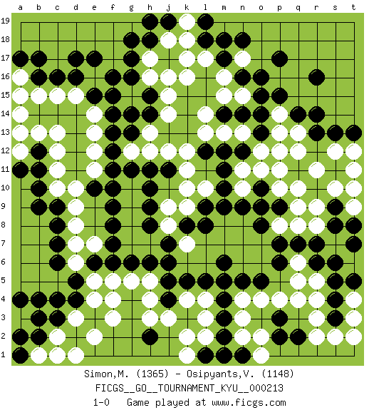 Last move : 1-0 2023 July 5 5:21:44 [Event "FICGS__GO__TOURNAMENT_KYU__000213"] [Site "FICGS"] [Date "2023.01.25"] [Round "1"] [Black "Simon,Mickael"] [White "Osipyants,Vladimir"] [Result "1-0"] [Rating 1 "1365"] [Rating 2 "1148"] 1.r16 q4 2.d17 d3 3.d5 f4 4.c3 c2 5.c4 e2 6.r6 q8 7.p6 o4 8.o8 r11 9.c9 d15 10.f16 c12 11.p17 k16 12.s4 r3 13.s3 s2 14.m3 n3 15.m4 j3 16.m17 h17 17.c16 c15 18.s8 r9 19.g17 h16 20.f14 l14 21.r13 p12 22.m6 d7 23.c7 d8 24.c8 d9 25.j5 h4 26.b2 b1 27.p2 o2 28.p3 p4 29.s9 s10 30.h8 k10 31.g6 d10 32.b11 c11 33.b12 b13 34.b10 b15 35.h18 j18 36.g18 k17 37.h10 e13 38.f13 e14 39.o10 q10 40.l9 l10 41.n12 k12 42.p9 q9 43.b16 a16 44.a17 a15 45.b17 p14 46.q14 q12 47.n14 q13 48.r14 p11 49.f12 e12 50.f11 h13 51.p15 s12 52.s13 t11 53.a2 l2 54.m2 n2 55.l1 k2 56.q2 r2 57.o14 p13 58.m9 k9 59.k8 j9 60.h9 j8 61.j7 k7 62.l8 h7 63.j6 g7 64.f7 g8 65.f8 g9 66.f9 g10 67.h11 g5 68.h6 e5 69.m10 m16 70.n16 m15 71.h14 j14 72.h15 j15 73.f15 h12 74.j11 k11 75.t13 t12 76.l18 k18 77.d4 e4 78.e6 d6 79.c6 j12 80.f10 l17 81.m18 n15 82.o16 n11 83.m11 o11 84.l12 l13 85.o15 m13 86.m12 t2 87.o5 r5 88.s5 q6 89.q7 q5 90.r7 p8 91.p7 n10 92.n9 k1 93.m1 n4 94.n5 k4 95.k5 l4 96.l5 l3 97.n1 o1 98.m5 r8 99.g16 t9 100.t7 t10 101.g13 g12 102.g11 e11 103.t8 a12 104.a11 c10 105.a13 a14 106.j19 k19 107.h19 e16 108.e17 h5 109.e15 a12 110.b9 t3 111.d16 n13 112.a13 c13 113.l19 t4 114.t5 r4 115.s6 a12 116.j17 j16 117.a13 p10 118.o9 a12 119.c1 d1 120.a13 n17 121.n18 a12 122.e3 f3 123.a13 e7 124.f6 a12 125.j4 f5 126.a13 g15 127.g14 a12 128.h2 h3 129.a13 b3 130.b4 a12 131.o13 o12 132.a13 a3 133.a4 a12 134.a1 c1 135.a13 a3 136.b3 a12 137.m14 a13 138.e10 1-0 Follow this game move after move (download)To invade, need 20 points in open area; otherwise, keshi is best. (Yang Yilun, 7p) Whenever people agree with me, I always feel I must be wrong. (Oscar Wilde)