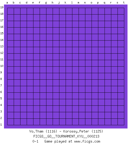 Last move : 0-1 2023 February 24 12:48:51 [Event "FICGS__GO__TOURNAMENT_KYU__000213"] [Site "FICGS"] [Date "2023.01.25"] [Round "1"] [Black "Vo,Tham"] [White "Korossy,Peter"] [Result "0-1"] [Rating 1 "1116"] [Rating 2 "1125"] 0-1 This go game has been lost on time (started : 2023.01.25 9:26:51) Follow this game move after move (download)Five groups might live but the six will die. (Anonymous) Life is pleasant. Death is peaceful. It's the transition that's troublesome. (Isaac Asimov)