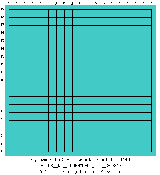 Last move : 0-1 2023 February 24 12:48:51 [Event "FICGS__GO__TOURNAMENT_KYU__000213"] [Site "FICGS"] [Date "2023.01.25"] [Round "1"] [Black "Vo,Tham"] [White "Osipyants,Vladimir"] [Result "0-1"] [Rating 1 "1116"] [Rating 2 "1148"] 0-1 This go game has been lost on time (started : 2023.01.25 9:26:51) Follow this game move after move (download)If a formation is symmetrical, play at the center. (Anonymous) Imagination is more important than knowledge. Knowledge is limited. Imagination encircles the world. (Albert Einstein)