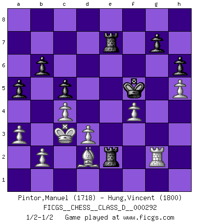 Last move : 1/2-1/2 2023 February 24 12:55:44 [Event "FICGS__CHESS__CLASS_D__000292"] [Site "FICGS"] [Date "2023.01.29"] [Round "1"] [White "Pintor,Manuel"] [Black "Hung,Vincent"] [Result "1/2-1/2"] [WhiteElo "1718"] [BlackElo "1800"] 1.e4 c5 2.f4 d5 3.exd5 Nf6 4.c4 e6 5.dxe6 Bxe6 6.Nf3 Nc6 7.Nc3 Bd6 8.d3 O-O 9.Be2 a6 10.O-O Qc7 11.Ng5 Bf5 12.g4 h6 13.Nge4 Nxg4 14.Bxg4 Bxg4 15.Qxg4 f5 16.Qg6 fxe4 17.Nxe4 Rad8 18.Rf3 Qf7 19.Qxf7+ Rxf7 20.Be3 Ne5 21.Nxd6 Nxf3+ 22.Kf2 Rxd6 23.Kxf3 b6 24.Rg1 Kf8 25.Ke2 Re6 26.Kd2 Rd7 27.Rg3 a5 28.h4 Kf7 29.Kc3 Kf6 30.h5 Kf5 31.a3 Rde7 32.Bd2 Re2 33.Rg6 R2e6 34.Rg2 Re2 1/2-1/2 Follow this game move after move (download)Chess is a terrible game. If you have no center, your opponent has a freer position. If you do have a center, then you really have something to worry about ! (Siegbert Tarrasch) Im Wettkampf zwischen starken Meistern kommen Fehler sehr selten vor, deshalb ist es mit bloßem Warten nicht getan. (José Raúl Capablanca) No es suficiente ser un buen jugador, se debe también de jugar bién. (Siegbert Tarrasch) Les écrivains ont utilisé les échecs pour analyser les côtés extrêmes de la nature humaine. Dans ce cadre, les échecs offrent un champ d'expérimentation idéal. Mais on pourrait faire la même chose avec la peinture. Et là, en vous référant à Van Gogh, vous ne tirerez pas de conclusion définitive sur les peintres. (Gary Kasparov) Wisdom doesn't necessarily come with age. Sometimes age just shows up all by itself. (Tom Watson)