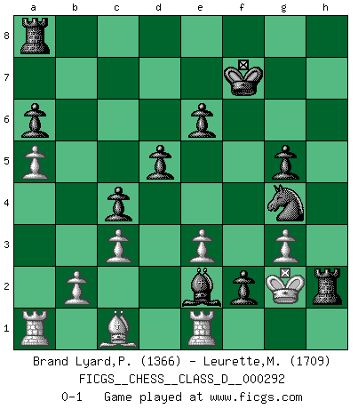 Last move : 0-1 2023 February 8 11:7:41 [Event "FICGS__CHESS__CLASS_D__000292"] [Site "FICGS"] [Date "2023.01.29"] [Round "1"] [White "Brand Lyard,Paul"] [Black "Leurette,Marc-Antoine"] [Result "0-1"] [WhiteElo "1366"] [BlackElo "1709"] 1.d4 d5 2.e3 Nc6 3.Bb5 Nf6 4.Nf3 Bd7 5.Bxc6 Bxc6 6.Ne5 e6 7.O-O Bb5 8.Nxf7 Kxf7 9.a4 Ba6 10.Re1 c5 11.c3 b6 12.dxc5 bxc5 13.Qf3 Bd3 14.Na3 Be4 15.Qf4 Bd6 16.Qh4 h6 17.Nb5 g5 18.Qh3 a6 19.Nxd6+ Qxd6 20.f3 Bd3 21.Rd1 c4 22.a5 h5 23.g4 hxg4 24.Qg3 Qxg3+ 25.hxg3 gxf3 26.Kf2 Be2 27.Re1 Ng4+ 28.Kg1 f2+ 29.Kg2 Rh2+ 0-1 Follow this game move after move (download)In blitz, the Knight is stronger than the Bishop. (Vlastimil Hort) Ich glaube nicht an Psychologie, ich glaube an gute Züge. (Robert James Fischer) Por esta medida (el intervalo entre Fischer y sus contemporaneos), yo le considero el mas grande campeón mundial. (Garry Kasparov) Le système Elo représente seulement une moyenne. Il est simplement un indicateur de votre stabilité. (Anatoli Karpov) Strategy without tactics is the slowest route to victory. Tactics without strategy is the noise before defeat. (Sun Tzu)