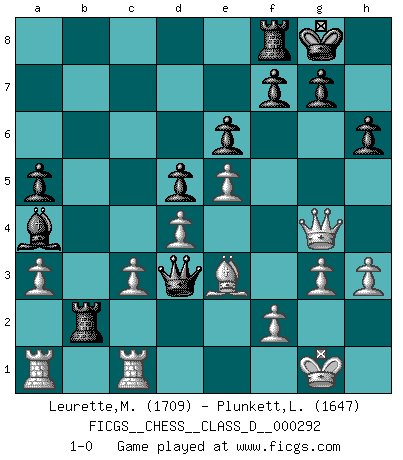 Last move : 1-0 2023 June 5 11:22:33 [Event "FICGS__CHESS__CLASS_D__000292"] [Site "FICGS"] [Date "2023.01.29"] [Round "1"] [White "Leurette,Marc-Antoine"] [Black "Plunkett,Louis"] [Result "1-0"] [WhiteElo "1709"] [BlackElo "1647"] 1.e4 c5 2.d4 cxd4 3.c3 d5 4.e5 e6 5.cxd4 Nc6 6.Nf3 Nge7 7.Bb5 Bd7 8.Nc3 a6 9.Bxc6 Nxc6 10.Be3 Bb4 11.a3 Bxc3+ 12.bxc3 h6 13.O-O O-O 14.Qc2 Na5 15.g3 Nc4 16.Nd2 Qc7 17.Nxc4 Qxc4 18.h3 Rac8 19.Rfc1 Ba4 20.Qb2 a5 21.Qxb7 Rb8 22.Qe7 Qd3 23.Qh4 Rb2 24.Qg4 1-0 This chess game has been lost on time (started : 2023.01.29 14:57:27) Follow this game move after move (download)I feel as if I were a piece in a game of Chess, when my opponent says of it: That piece cannot be moved. (Soren Kierkegaard) Viele Opfer benötigen überhaupt keine konkrete Berechnung. Es genügt sich die entstehende Position kurz vorzustellen, um uns davon zu überzeugen, dass das Opfer korrekt ist. (Mikhail Nekhemyevich Tal) El Ajedrez es un mar en el cual un mosquito puede beber y un elefante puede bañarse. (Refrán Hindú) Toute estimation doit être constamment réévaluée. (Jacob Estrin) Yoga is 99% practice and 1% knowledge. (Sri Krishna Pattabhi Jois)