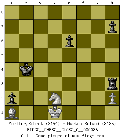 Last move : 0-1 2008 May 17 7:19:31 [Event "FICGS__CHESS__CLASS_A__000026"] [Site "FICGS"] [Date "2007.08.23"] [Round "1"] [White "Mueller,Robert"] [Black "Markus,Roland"] [Result "0-1"] [WhiteElo "2194"] [BlackElo "2125"] 1.e4 e5 2.Nf3 Nf6 3.Nxe5 d6 4.Nf3 Nxe4 5.d4 d5 6.Bd3 Be7 7.O-O Nc6 8.c4 Nb4 9.cxd5 Nxd3 10.Qxd3 Qxd5 11.Re1 Bf5 12.Ne5 O-O-O 13.Qf3 g6 14.g4 Rhg8 15.gxf5 Bb4 16.Rxe4 gxf5 17.Kf1 fxe4 18.Qf5+ Qe6 19.Qxe6+ fxe6 20.Be3 c5 21.Na3 Bxa3 22.bxa3 cxd4 23.Rc1+ Kb8 24.Bf4 Ka8 25.Nf7 Rc8 26.Nd6 Rxc1+ 27.Bxc1 e3 28.fxe3 Rd8 29.Nb5 Rc8 30.Bb2 dxe3 31.Bd4 b6 32.Nc3 Rd8 33.Be5 Rd2 34.Ke1 Kb7 35.a4 Kc6 36.a3 Kc5 37.Nd1 Rd3 38.Ke2 Rxa3 39.Nc3 Kc4 40.Nd1 a5 41.Nxe3+ Kb3 42.Bc7 Rxa4 43.Bxb6 Ra1 44.Nf1 a4 45.Nd2+ Kb4 46.Bd4 Rc1 47.Bb2 Rc8 48.Bg7 a3 49.Kd1 a2 50.Bb2 Rc3 51.Ba1 Rh3 0-1 Petrov : Classical attack Kingside Castling by player White (move 7) Queenside Castling by player Black (move 12) 10 pieces endgame at move 42 : White KBNP , Black KRPPPP WHITE : King + 1 Bishop 1 Knight 1 Pawn BLACK : King + 1 Rook 4 Pawns 9 pieces endgame at move 43 : White KBNP , Black KRPPP WHITE : King + 1 Bishop 1 Knight 1 Pawn BLACK : King + 1 Rook 3 Pawns Player Black won this chess game. Follow this game move after move (download)You are for me the Queen on d8 and I am the Pawn on d7 !! (Eduard Gufeld) Schach ist die gewalttätigste aller Sportarten. (Garry Kasparov) La vida es como el Ajedrez, con lucha, competición y eventos buenos y malos. (Benjamin Franklin) Shah mat. Le roi est mort. Cri de fierté d'un joueur venant de terrasser son adversaire, courtoisement, sans effusion de sang. Logic : The art of thinking and reasoning in strict accordance with the limitations and incapacities of the human misunderstanding. (Ambrose Bierce)