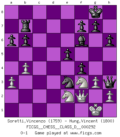 Last move : 0-1 2023 February 25 5:52:18 [Event "FICGS__CHESS__CLASS_D__000292"] [Site "FICGS"] [Date "2023.01.29"] [Round "1"] [White "Soretti,Vincenzo"] [Black "Hung,Vincent"] [Result "0-1"] [WhiteElo "1759"] [BlackElo "1800"] 1.e4 c5 2.Nf3 d6 3.d4 cxd4 4.Nxd4 Nf6 5.Nc3 a6 6.Bg5 e6 7.Be2 Be7 8.O-O O-O 9.Qd2 Qc7 10.f4 Nbd7 11.Bf3 Rb8 12.a3 b6 13.b4 Bb7 14.Rae1 h6 15.Bxf6 Bxf6 16.Nde2 Rfc8 17.e5 dxe5 18.Bxb7 Rxb7 19.Rf3 exf4 20.Nd4 Ne5 21.Rh3 Nc4 22.Qf2 Ne3 23.Nce2 e5 24.Nf3 Qxc2 25.Rc1 Qf5 26.Rxc8+ Qxc8 27.g3 Qxh3 0-1 Follow this game move after move (download)Chess makes man wiser and clear-sighted. (Vladimir Putin) Ich glaube, ich kenne inzwischen die Gründe für mein Versagen: schachliche Charakterfehler. Ich war nie ein Wunderkind und in meiner gesamten menschlichen Entwicklung immer zu langsam. (Viktor Kortschnoi) Fischer es el jugador mas fuerte del mundo. De hecho, el jugador mas fuerte que jamas haya existido. (Larry Evans) La victoire dans une partie d'Echecs appartient la plupart du temps à celui qui voit un peu plus loin que l'adversaire. (Lasker) For a mechanic, you seem to do an excessive amount of thinking. (C-3PO in Star Wars ep.2)