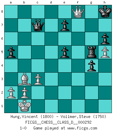 Last move : 1-0 2023 March 5 10:6:43 [Event "FICGS__CHESS__CLASS_D__000292"] [Site "FICGS"] [Date "2023.01.29"] [Round "1"] [White "Hung,Vincent"] [Black "Vollmer,Steve"] [Result "1-0"] [WhiteElo "1800"] [BlackElo "1750"] 1.e4 c5 2.Nf3 d6 3.d4 cxd4 4.Nxd4 Nf6 5.Nc3 a6 6.Be3 g6 7.f3 Bg7 8.Qd2 Nc6 9.O-O-O Qc7 10.Nd5 Nxd5 11.exd5 Ne5 12.Bh6 O-O 13.Bxg7 Kxg7 14.g4 Bd7 15.h4 h6 16.Be2 Rac8 17.h5 g5 18.f4 gxf4 19.Qxf4 f6 20.Kb1 Rh8 21.Bd3 Rcg8 22.Ne6+ Bxe6 23.dxe6 Kf8 24.Rhg1 Rg5 25.Bf5 Kg7 26.c3 Rc8 27.Rd4 b5 28.Bc2 a5 29.Qe4 Rh8 30.Rd5 f5 31.Qe2 Rf8 32.Rxb5 Rf6 33.Rf1 fxg4 34.Rxf6 Kxf6 35.Qe4 Kxe6 36.Bb3+ Kf6 37.Qf4+ Kg7 38.Rxe5 dxe5 39.Qf7+ Kh8 40.Qf8+ 1-0 Follow this game move after move (download)The combination player thinks forward; he starts from the given position, and tries the forceful moves in his mind. (Emanuel Lasker) Es ist im Leben wie im Schachspiel. Wir entwerfen einen Plan, dieser bleibt jedoch bedingt durch das, was im Schachspiel dem Gegner, im Leben dem Schicksal zu tun belieben wird. (Arthur Schopenhauer) Un sacrificio se refuta mucho mejor al aceptarlo. (Wilhelm Steinitz) Avec des compensations pour le matériel en plus... (Anonyme) Ah, beer! The cause of, and the solution to, all of life's problems. (Homer Simpson)