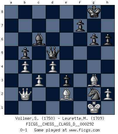 Last move : 0-1 2023 February 12 12:28:19 [Event "FICGS__CHESS__CLASS_D__000292"] [Site "FICGS"] [Date "2023.01.29"] [Round "1"] [White "Vollmer,Steve"] [Black "Leurette,Marc-Antoine"] [Result "0-1"] [WhiteElo "1750"] [BlackElo "1709"] 1.e4 e5 2.Nf3 Nc6 3.Bb5 a6 4.Ba4 b5 5.Bb3 Nf6 6.O-O Bb7 7.c3 Be7 8.d3 h6 9.Nbd2 O-O 10.Re1 Re8 11.Nf1 d6 12.Ne3 Bf8 13.a4 g6 14.Bc2 Ne7 15.b4 c6 16.Bb2 Nc8 17.Bb3 c5 18.axb5 axb5 19.Rxa8 Bxa8 20.Qa1 Nb6 21.Qa2 Qd7 22.Ra1 Bb7 23.Qb1 c4 24.Bc2 d5 25.exd5 Nbxd5 26.Ra7 cxd3 27.Bxd3 Nxe3 28.fxe3 e4 29.Be2 Ra8 30.Rxa8 Bxa8 31.Nd4 Bc6 32.Qa1 Bg7 33.Bc1 Nd5 34.Bd2 Bxd4 35.exd4 e3 36.Be1 Nf4 37.Qb2 Nxg2 38.Bg3 Qd5 0-1 Follow this game move after move (download)When asked, -How is that you pick better moves than your opponents?, I responded: I'm very glad you asked me that, because, as it happens, there is a very simple answer. I think up my own moves, and I make my opponent think up his. (Alexander Alekhine) Modernes Schach sorgt sich zuviel um Dinge wie Bauernstruktur usw. Vergessen Sie das, Schachmatt beendet das Spiel! (Nigel Short) Hay jugadores fuertes y personas amables y yo soy un jugador fuerte. (Bobby Fischer) Le joueur d'Echecs qui veut atteindre le top est obligé de développer son propre credo créatif. Alexeï Stepanovicth Souétine. Il est facile d'écrire des livres ! Ce qui est difficile, c'est de jouer ! (Alexeï Stepanovicth Souétine) Wawaweewa ! (Borat: Cultural learnings of America for make benefit glorious nation of Kazakhstan)