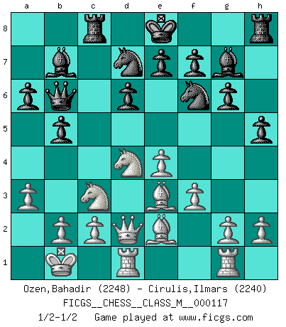 Last move : 1/2-1/2 2023 February 15 21:45:18 [Event "FICGS__CHESS__CLASS_M__000117"] [Site "FICGS"] [Date "2023.02.01"] [Round "1"] [White "Ozen,Bahadir"] [Black "Cirulis,Ilmars"] [Result "1/2-1/2"] [WhiteElo "2248"] [BlackElo "2240"] 1.e4 c5 2.Nf3 d6 3.d4 cxd4 4.Nxd4 Nf6 5.Nc3 a6 6.Rg1 h5 7.Bg5 b5 8.a3 Bb7 9.Qd2 Nbd7 10.O-O-O Rc8 11.f3 g6 12.Be2 Qb6 13.Kb1 Bg7 14.Be3 1/2-1/2 Follow this game move after move (download)Castle early and often. (Rob Sillars) Garry Kasparov war erst in der Großmeister-Organisation GMA, dann in der Profischach-Vereinigung PCA, zum Schluss kehrte er wieder in den Schoß der FIDE zurück. Aber gut, manche Leute sind flexibel (Viswanathan Anand) El Ajedrez es un terrible juego. Si no controlas el centro, tu oponente tiene una posición mas holgada. Si tienes control del centro, ¡entonces realmente tu tienes algo de que preocuparte!. (Siegbert Tarrasch) RxDa4 pat (...) Tomorrow's what you make of it. (Horatio Caine, C.S.I. Miami)