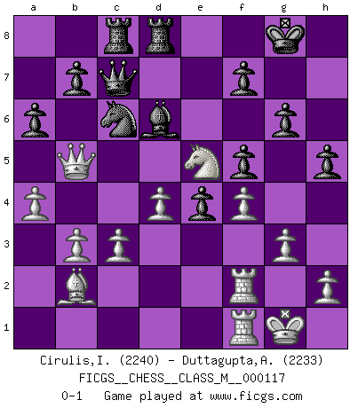 Last move : 0-1 2023 April 21 1:46:19 [Event "FICGS__CHESS__CLASS_M__000117"] [Site "FICGS"] [Date "2023.02.01"] [Round "1"] [White "Cirulis,Ilmars"] [Black "Duttagupta,Aniruddha"] [Result "0-1"] [WhiteElo "2240"] [BlackElo "2233"] 1.f4 d5 2.d4 Nf6 3.e3 Bf5 4.Nf3 e6 5.c3 Bd6 6.b3 O-O 7.Bd3 c5 8.O-O Nc6 9.Bxf5 exf5 10.Qd3 cxd4 11.exd4 g6 12.Ne5 Rc8 13.Nd2 Qa5 14.Bb2 Rfd8 15.a4 Qc7 16.Rae1 Qb6 17.Qb5 Qc7 18.Re2 Ne4 19.Nxe4 dxe4 20.Ref2 h5 21.g3 a6 0-1 Follow this game move after move (download)Checkers is for tramps. (Paul Morphy) Capablanka war das größte Genie der Schachgeschichte! Aber denken sie nicht er habe nichts vom Schach verstanden. Er wusste nur soviel wie er wissen musste um seine Ziele zu erreichen. (Mikhail Moiseyevich Botvinik) Peones: ellos son el alma de esta partida, solos forman el ataque y la defensa. (Philidor) L'ordinateur a tué l'originalité. Il n'y a plus guère d'aventures sur l'échiquier. (Jacob Murray) The good fighters of old first put themselves beyond the possibility of defeat, and then waited for an opportunity of defeating the enemy. (Sun Tzu)