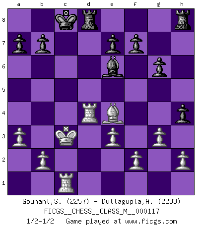 Last move : 1/2-1/2 2023 March 1 16:41:13 [Event "FICGS__CHESS__CLASS_M__000117"] [Site "FICGS"] [Date "2023.02.01"] [Round "1"] [White "Gounant,Stanislas"] [Black "Duttagupta,Aniruddha"] [Result "1/2-1/2"] [WhiteElo "2257"] [BlackElo "2233"] 1.Nf3 Nf6 2.g3 c5 3.Bg2 Nc6 4.c4 d5 5.cxd5 Nxd5 6.d4 cxd4 7.Nxd4 Ndb4 8.Nxc6 Qxd1+ 9.Kxd1 Nxc6 10.Nc3 Bd7 11.Be3 g6 12.Rc1 Bg7 13.Kc2 Nd4+ 14.Bxd4 Bxd4 15.e3 Bxc3 16.Kxc3 O-O-O 17.Be4 h5 18.Rhd1 h4 19.Rd4 Be6 20.a3 1/2-1/2 Follow this game move after move (download)Chess, like love, is infectious at any age. (Flohr) Ja, jede Frau in Holland liebt mich bestimmt, und alle Männer hassen mich. (Loek van Wely) Debió haber existido una vez en que los hombres eran semidióses, de otra manera no hubiesen podido inventar el Ajedrez. (Gustav Schenk) 'L'échange des dames est un coup dur pour les deux adversaires...' Un journaliste lors d'une partie du match Spassky-Fischer The only difference between a tax man and a taxidermist is that the taxidermist leaves the skin. (Mark Twain)