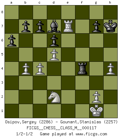 Last move : 1/2-1/2 2023 February 11 0:39:32 [Event "FICGS__CHESS__CLASS_M__000117"] [Site "FICGS"] [Date "2023.02.01"] [Round "1"] [White "Osipov,Sergey"] [Black "Gounant,Stanislas"] [Result "1/2-1/2"] [WhiteElo "2286"] [BlackElo "2257"] 1.c4 e5 2.Nc3 Bb4 3.Nd5 Be7 4.Nf3 d6 5.d4 e4 6.Nd2 f5 7.e3 Nf6 8.Nxe7 Qxe7 9.b4 O-O 10.Be2 a6 11.O-O Nc6 12.a3 Bd7 13.Bb2 Qf7 14.Qb3 Rae8 15.a4 Ne7 16.Rae1 f4 17.exf4 Ng6 18.Qg3 Bxa4 19.d5 Bd7 20.h4 Ne7 21.Bxf6 Nf5 22.Qc3 e3 23.fxe3 Rxe3 24.Bd3 Qxf6 25.Qxf6 Rxf6 26.Bxf5 Rxe1 27.Bxh7+ Kxh7 28.Rxe1 Rxf4 29.Re7 1/2-1/2 Follow this game move after move (download)Fischer was a master of clarity and a king of artful positioning. His opponents would see where he was going but were powerless to stop him. (Bruce Pandolfini) Frage des Reporters: -Welche besonderen Umstände rechtfertigen das Anhalten der Uhren während einer Turnierpartie? Antwort: -Einen Fotographen zu strangulieren. (Siegbert Tarrasch) Un jugador que es sorprendido, esta derrotado a medias. (Proverbio) Vous savez, camarade Pachman, je n'éprouve pas de plaisir à être ministre, je jouerais plutôt aux échecs comme vous, ou alors ferais une révolution au Venezuela. (Che Guevara à Ludek Pachman, 'Checkmate in Prague', 1975) To send light into the darkness of men's hearts - such is the duty of the artist. (Schumann)