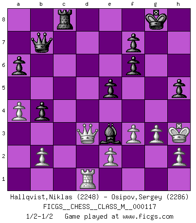 Last move : 1/2-1/2 2023 April 30 17:15:25 [Event "FICGS__CHESS__CLASS_M__000117"] [Site "FICGS"] [Date "2023.02.01"] [Round "1"] [White "Hallqvist,Niklas"] [Black "Osipov,Sergey"] [Result "1/2-1/2"] [WhiteElo "2248"] [BlackElo "2286"] 1.c4 Nf6 2.g3 e6 3.Bg2 d5 4.Nf3 dxc4 5.Qa4+ Bd7 6.Qxc4 c5 7.Nc3 Bc6 8.O-O a6 9.d4 b5 10.Qd3 cxd4 11.Nxd4 Bxg2 12.Kxg2 Nbd7 13.Rd1 Ne5 14.Qc2 Qe7 15.a4 b4 16.Ne4 Qb7 17.f3 Rc8 18.Nxf6+ gxf6 19.Qb3 Bc5 20.Bf4 O-O 21.Rac1 Rfe8 22.Kh3 h5 23.Rc2 Ba7 24.Rxc8 Rxc8 25.Nc2 Nc6 26.Be3 Na5 27.Qd3 Nc4 28.Bd4 e5 29.Ne3 Nxe3 30.Bxe3 Bxe3 1/2-1/2 Follow this game move after move (download)We like to think. (Gary Kasparov) Wer wird heute Abend ihr Gegner sein? -- Heute Abend spiele ich gegen die schwarzen Steine. (Akiba Rubinstein) Tu puedes aprender mucho mas de una partida que pierdas que de una partida ganada. Tendras que perder cientos de partidas antes de llegar a ser un buen jugador. (Jose Raul Capablanca) Des combinaisons [dans le jeu d'échecs] pareilles à des mélodies. Je crois entendre pour ainsi dire la musique des coups... (Vladimir Nabokov) The faster the computer, the slower the brain. (Thibault de Vassal)