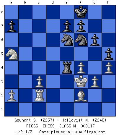 Last move : 1/2-1/2 2023 June 1 1:46:7 [Event "FICGS__CHESS__CLASS_M__000117"] [Site "FICGS"] [Date "2023.02.01"] [Round "1"] [White "Gounant,Stanislas"] [Black "Hallqvist,Niklas"] [Result "1/2-1/2"] [WhiteElo "2257"] [BlackElo "2248"] 1.Nf3 c5 2.g3 g6 3.Bg2 Bg7 4.c4 Nc6 5.Nc3 Nf6 6.d4 d5 7.dxc5 dxc4 8.Qxd8+ Nxd8 9.O-O Bd7 10.Ne5 Rc8 11.Rd1 Be6 12.Be3 O-O 13.h3 h5 14.Rac1 Nc6 15.f4 Rb8 16.Nf3 Rfd8 17.Ng5 Bd7 18.Rd2 Nh7 19.Nf3 Bf5 20.Rcd1 Rxd2 21.Rxd2 Rc8 22.Bf2 Bxc3 23.bxc3 Be4 24.Rb2 Rc7 25.Nd2 Bxg2 26.Kxg2 Nf6 27.Kf3 Nd5 28.Rc2 Nd8 29.e4 Nf6 30.Nxc4 Ne6 31.c6 Rxc6 32.Na5 Rc8 33.Nxb7 Rc4 34.Na5 Rxe4 35.h4 Kf8 1/2-1/2 Follow this game move after move (download)Not only will I predict his triumph over Botvinnik, but I'll go further and say that he'll probably be the greatest Chess player that ever lived. (John Collins) Der beste Spieler in einem Turnier gewinnt es nie. Er landet auf Platz zwei oder drei. (Siegbert Tarrasch) Coloca el contenido de las piezas del Ajedrez en un sombrero, agitalo vigorosamente, arrojalas en un tablero desde una altura de 30 centimetros y así obtendras el estilo de Steinitz. (H. E. Bird) Que feriez-vous si vous étiez en train de jouer aux échecs et que la fin du monde arrive ? Je continuerais à jouer. (Saint Borromée) Statistics can be made to prove anything - even the truth. (Author unknown)