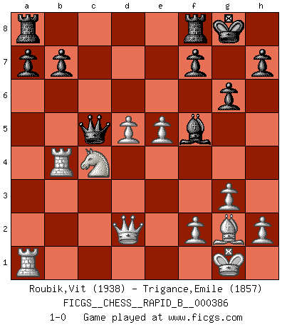 Last move : 1-0 2023 April 20 19:40:59 [Event "FICGS__CHESS__RAPID_B__000386"] [Site "FICGS"] [Date "2023.02.03"] [Round "1"] [White "Roubik,Vit"] [Black "Trigance,Emile"] [Result "1-0"] [WhiteElo "1938"] [BlackElo "1857"] 1.d4 Nf6 2.c4 g6 3.g3 d5 4.cxd5 Nxd5 5.Bg2 Bg7 6.e4 Nb4 7.a3 N4c6 8.d5 Nd4 9.Nf3 c5 10.Nbd2 O-O 11.O-O e5 12.b4 cxb4 13.Nxd4 exd4 14.Bb2 bxa3 15.Bxa3 Re8 16.Nc4 Bf8 17.Bxf8 Rxf8 18.Qxd4 Na6 19.Rfb1 Qc7 20.e5 Qc5 21.Qf4 Nb4 22.Qd2 Bf5 23.Rxb4 1-0 Follow this game move after move (download)In complicated positions, Bobby Fischer hardly had to be afraid of anybody. (Paul Keres) Fischer ist das größte Genie, das je vom Schachhimmel heruntergestiegen ist. (Mikhail Nekhemyevich Tal) El Peón aislado arroja penumbra sobre todo el tablero. (Aaron Nimzovich) Des points faibles ou des trous dans la position de l'adversaire doivent être occupés par des pièces et non pas par des pions. (Siegbert Tarrasch) Winning isn't everything... but losing is nothing. (Mednis)