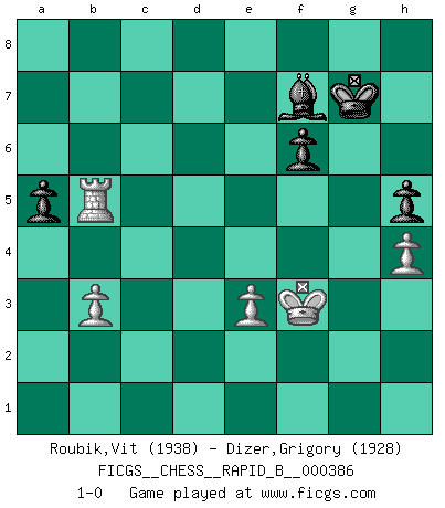 Last move : 1-0 2023 May 14 17:13:24 [Event "FICGS__CHESS__RAPID_B__000386"] [Site "FICGS"] [Date "2023.02.03"] [Round "1"] [White "Roubik,Vit"] [Black "Dizer,Grigory"] [Result "1-0"] [WhiteElo "1938"] [BlackElo "1928"] 1.d4 d5 2.c4 e6 3.g3 c6 4.Bg2 Nf6 5.Nf3 Be7 6.O-O O-O 7.b3 b6 8.Qc2 Nbd7 9.Bb2 Bb7 10.Rd1 Rc8 11.Nc3 Qc7 12.e3 Rfd8 13.Rac1 Qb8 14.Qe2 c5 15.cxd5 Nxd5 16.Nxd5 Bxd5 17.e4 Bb7 18.d5 exd5 19.exd5 Re8 20.Qc4 Rcd8 21.Nd2 Ne5 22.Bxe5 Qxe5 23.d6 Bxg2 24.dxe7 Rd4 25.Qb5 Rxe7 26.Nc4 Qg5 27.h4 Qd5 28.Ne3 Rxe3 29.Rxd4 Qxd4 30.fxe3 Qe4 31.Rd1 g6 32.Rd8+ Kg7 33.Qe8 Qxe8 34.Rxe8 Bc6 35.Re7 a5 36.Ra7 Bd5 37.Ra6 c4 38.Rxb6 cxb3 39.axb3 f6 40.Kf2 h6 41.Rb5 Bf7 42.Kf3 g5 43.Rb7 h5 44.Rb5 gxh4 45.gxh4 1-0 Follow this game move after move (download)The Chess pieces are the block alphabet which shapes thoughts; and these thoughts, although making a visual design on the chessboard, express their beauty abstractly, like a poem. (Marcel Duchamp) Ich moechte nie einem Club beitreten, der Leute wie mich als Mitglieder aufnimmt. (Woody Allen) El Ajedrez es 99 por ciento táctica. (Teichmann) Toutes les manuvres exécutées sur une colonne ouverte ont pour but ultime l'intrusion définitive sur la septième ou la huitième rangée, en plein cur de la position ennemie. (Aaron Nimzovitch) There's no money in correspondence chess. (John Knudsen)