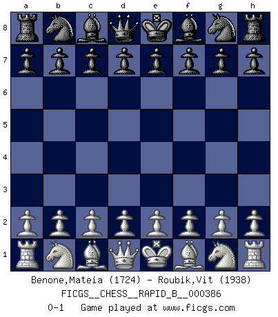 Last move : 0-1 2023 March 5 12:9:24 [Event "FICGS__CHESS__RAPID_B__000386"] [Site "FICGS"] [Date "2023.02.03"] [Round "1"] [White "Benone,Mateia"] [Black "Roubik,Vit"] [Result "0-1"] [WhiteElo "1724"] [BlackElo "1938"] 0-1 This chess game has been lost on time (started : 2023.02.03 1:42:34) Follow this game move after move (download)Fischer prefers to enter Chess history alone. (Miguel Najdorf) Ich weiss nicht was Gott gegen mich auf 1.e4 antworten würde. (Robert James Fischer) El Ajedrez es despiadado: debes de estar preparado para matar gente. (Nigel Short) La vie et les Echecs sont tous les deux une lutte constante. (Lasker) Men should grow up. - Yeah. And dogs should stop licking themselves. It's not gonna happen. (Gregory House to Dr. Cameron, House M.D.)