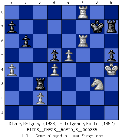 Last move : 1-0 2023 May 16 15:48:34 [Event "FICGS__CHESS__RAPID_B__000386"] [Site "FICGS"] [Date "2023.02.03"] [Round "1"] [White "Dizer,Grigory"] [Black "Trigance,Emile"] [Result "1-0"] [WhiteElo "1928"] [BlackElo "1857"] 1.e4 e6 2.Nc3 d5 3.d4 Bb4 4.e5 Ne7 5.a3 Bxc3+ 6.bxc3 b6 7.Qg4 Ng6 8.h4 h5 9.Qg3 Ba6 10.Bxa6 Nxa6 11.Bg5 Qd7 12.Ne2 Nb8 13.a4 Ne7 14.Bxe7 Qxe7 15.Qxg7 Qf8 16.Qxf8+ Kxf8 17.f4 Nc6 18.f5 exf5 19.O-O Ne7 20.Ng3 f4 21.Rxf4 Ng6 22.Rf6 Re8 23.Raf1 Kg8 24.Rxf7 Re7 25.R7f6 Nxh4 26.Kh2 c5 27.Kh3 Nxg2 28.Kxg2 cxd4 29.cxd4 Rc7 30.Kh3 R8h7 31.Rf8+ Kg7 32.R1f6 Rc3 33.Kh4 1-0 Follow this game move after move (download)Tactics flow from a superior position. (Bobby Fischer) Schach ist gnadenlos. Du mußt bereit sein zu töten. (Nigel Short) Después de la respuesta de las negras a 1.e4 con 1..e5, se quedan siempre tratando de entrar dentro del juego. (Howard Staunton) Il vaut toujours mieux jouer un plan faux de façon logique que de n'avoir pas de plan du tout. (Victor Kortchnoï) Imagination is more important than knowledge. Knowledge is limited. Imagination encircles the world. (Albert Einstein)