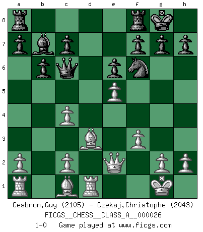 Last move : 1-0 2007 November 1 10:38:46 [Event "FICGS__CHESS__CLASS_A__000026"] [Site "FICGS"] [Date "2007.08.23"] [Round "1"] [White "Cesbron,Guy"] [Black "Czekaj,Christophe"] [Result "1-0"] [WhiteElo "2105"] [BlackElo "2043"] 1.e4 e6 2.d4 d5 3.Nd2 dxe4 4.Nxe4 Qd5 5.Nc3 Bb4 6.Nf3 Nf6 7.Bd3 b6 8.O-O Bxc3 9.bxc3 Bb7 10.c4 Qd6 11.Qe2 O-O 12.Rd1 Nbd7 13.Ne5 Nxe5 14.dxe5 Qc6 15.f3 1-0 French : Tarrasch Kingside Castling by player White (move 8) Kingside Castling by player Black (move 11) Player White won this chess game. Follow this game move after move (download)Chess is no whit inferior to the violin, and we have a large number of professional violinists. (Mikhail Botvinnik) Wenn Du einsam bist, wenn Du Dich in der Welt wie ein Fremder fühlst, spiele Schach. Das wird Deinen Geist erheben und Dein Ratgeber im Kampf sein. (Aristoteles) Diferente gente reacciona diferentemente en aceptar la derrota. (Bobby Fischer) Mais n'est-ce pas déjà le limiter injurieusement que d'appeler les échecs un jeu? N'est-ce pas aussi une science, un art, ou quelque chose qui, comme le cercueil de Mahomet entre ciel et terre, est suspendu entre l'un et l'autre, et qui réunit un nombre incroyable de contraires ? (Stefan Zweig) Methinks King Thibault should dub Marius Zubac a knight of the square board... I mean table, henceforth addressing him as Sir Marius, and bestow on him a suitable land from the kingdom of FICGS & marry him off to a worthy, fair maiden, lest he slice our heads with his mighty sword in his wrath. (Dinesh De Silva)
