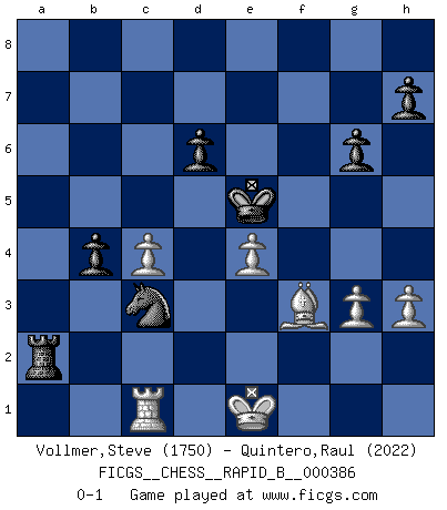 Last move : 0-1 2023 February 25 14:11:3 [Event "FICGS__CHESS__RAPID_B__000386"] [Site "FICGS"] [Date "2023.02.03"] [Round "1"] [White "Vollmer,Steve"] [Black "Quintero,Raul"] [Result "0-1"] [WhiteElo "1750"] [BlackElo "2022"] 1.Nf3 d6 2.d4 Nf6 3.g3 g6 4.Bg2 Bg7 5.c4 O-O 6.O-O c6 7.Nc3 Bf5 8.Nh4 Be6 9.d5 Bd7 10.e4 Na6 11.Qe2 cxd5 12.cxd5 Qa5 13.h3 Nc5 14.Be3 Rfc8 15.Rfd1 Na4 16.Bd4 Ne8 17.Bxg7 Nxg7 18.Nxa4 Qxa4 19.b3 Qb4 20.Rac1 a5 21.Nf3 a4 22.Rxc8+ Rxc8 23.Nd4 Ne8 24.Kh2 axb3 25.axb3 Nc7 26.Bf1 e5 27.dxe6 Nxe6 28.Nf3 Bc6 29.Nd2 Ra8 30.Qc4 Qc5 31.Kg1 b5 32.Qc1 Qxc1 33.Rxc1 Nd4 34.Rd1 Ra2 35.Bg2 Ne2+ 36.Kf1 Nc3 37.Rc1 b4 38.Ke1 f5 39.f3 fxe4 40.fxe4 Bb5 41.Bf3 Kf7 42.Bd1 Bd3 43.Bf3 Ke6 44.Nc4 Bxc4 45.bxc4 Ke5 0-1 Follow this game move after move (download)He who takes the Queen's Knight's Pawn will sleep in the streets. (Anonymous) Die Neutralität betrachte ich als eine schwere Krankheit. (Viktor Kortschnoi) El Ajedrez no es como la vida... ¡tiene reglas!. (Mark Pasternak) Si le désir cupide (et stupide) de gagner est une inépuisable source de souffrance, une combinaison brillante sur l'échiquier est une découverte : le coquelicot qui s'épanouit lorsque apparaît la Voie Lactée. (Arrabal) There is no vagueness without wind. (Chinese proverb)