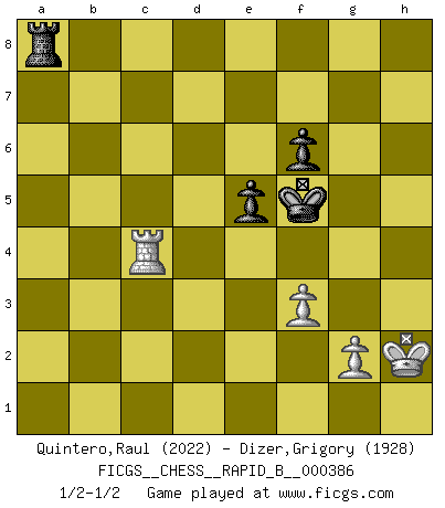 Last move : 1/2-1/2 2023 April 7 21:19:46 [Event "FICGS__CHESS__RAPID_B__000386"] [Site "FICGS"] [Date "2023.02.03"] [Round "1"] [White "Quintero,Raul"] [Black "Dizer,Grigory"] [Result "1/2-1/2"] [WhiteElo "2022"] [BlackElo "1928"] 1.Nf3 d5 2.b3 Nf6 3.Bb2 c5 4.e3 e6 5.d4 b6 6.Bb5+ Bd7 7.Bd3 Bd6 8.O-O O-O 9.c4 cxd4 10.exd4 Bc8 11.Nc3 Bb7 12.Re1 Nbd7 13.Ne5 a6 14.Rc1 Rc8 15.Re3 g6 16.Be2 Ne4 17.cxd5 Nxc3 18.Bxc3 Nxe5 19.dxe5 Bc5 20.Rg3 Qxd5 21.Qf1 a5 22.Rd3 Qc6 23.Bd4 Rfd8 24.Bf3 Qd7 25.Bxb7 Qxb7 26.Bxc5 bxc5 27.h3 Qc7 28.Rcd1 Rxd3 29.Rxd3 Qxe5 30.Qc1 h5 31.Rc3 Kg7 32.Rc4 Rc6 33.a3 Rc8 34.Rc3 Qd4 35.Rc4 Qe5 36.Rc3 Rd8 37.Rxc5 Qf6 38.Rxa5 Rd3 39.Rb5 Qd4 40.Rb4 Qd6 41.Qf4 Qxf4 42.Rxf4 Rxb3 43.Ra4 Kf6 44.h4 Kf5 45.f3 Rc3 46.Kh2 f6 47.Ra8 g5 48.hxg5 Kxg5 49.Kg3 Rc1 50.a4 e5 51.a5 h4+ 52.Kh2 Ra1 53.Rg8+ Kf5 54.Rg4 Rxa5 55.Rxh4 Ra3 56.Rc4 Ra8 1/2-1/2 Follow this game move after move (download)Let the perfectionist play postal. (Yasser Seirawan) Man wirke der falschen Auffassung entgegen, als ob jeder Zug Unmittelbares zu leisten habe; auch Werte- und Ruhezüge haben ihre Existenzberechtigung. (Aaron Nimzowitsch) Yo he agregado estos principios a la ley: pongan los Caballos en acción antes de que los dos Alfiles sean desarrollados. (Emanuel Lasker) Roi des jeux et jeu des rois, les échecs portent en eux un sentiment d'infini. Ils donnent à celui qui s'est efforcé d'en approfondir les arcanes l'impression de n'être pas à la mesure de l'homme; en fait, ils constituent un résumé de l'univers, un microcosme, et figurent cette grande échelle qui, dans les plans de la lumière descend jusqu'à la matière, qui des abîmes insondables remonte jusqu'en l'infini de Dieu. (Pyrame) Whenever people agree with me, I always feel I must be wrong. (Oscar Wilde)