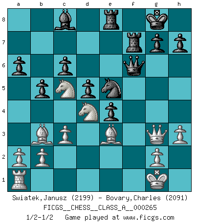 Last move : 1/2-1/2 2023 March 28 17:4:40 [Event "FICGS__CHESS__CLASS_A__000265"] [Site "FICGS"] [Date "2023.02.05"] [Round "1"] [White "Swiatek,Janusz"] [Black "Bovary,Charles"] [Result "1/2-1/2"] [WhiteElo "2199"] [BlackElo "2091"] 1.e4 e5 2.Nf3 Nc6 3.Bb5 a6 4.Ba4 Nf6 5.O-O Nxe4 6.d4 b5 7.Bb3 d5 8.dxe5 Be6 9.c3 Bc5 10.Nbd2 O-O 11.Bc2 Nxf2 12.Rxf2 f6 13.Qf1 fxe5 14.Nb3 Bxf2+ 15.Qxf2 e4 16.Qe1 Qd6 17.Nfd4 Ne5 18.Qg3 Bg4 19.Nc5 Rf7 20.Bb3 Re8 21.Nb7 Qf6 22.Be3 c6 23.Nc5 Bc8 24.h3 1/2-1/2 Follow this game move after move (download)I feel as if I were a piece in a game of Chess, when my opponent says of it: That piece cannot be moved. (Soren Kierkegaard) Ich tröste mich mit dem Vergnügen, daß Schachfans, Zuschauer und Leser glücklich sind, wenn ein Großmeister etwas riskiert, statt nur Klötzchen zu schieben. (Mikhail Nekhemyevich Tal) Solo puedes ser bueno en el Ajedrez si amas al juego. (Bobby Fischer) Assurément je connaissais par expérience le mystérieux attrait de ce jeu royal, le seul entre tous les jeux inventés par les hommes qui échappe souverainement à la tyrannie du hasard, le seul où l'on ne doive sa victoire qu'à son intelligence ou plutôt à une certaine forme d'intelligence. Mais n'est-ce pas déjà le limiter injurieusement que d'appeler les échecs un jeu ? N'est-ce pas une science, un art ou quelque chose qui, comme le cercueil de Mahomet entre ciel et terre, est suspendu entre l'un et l'autre, et qui réunit un nombre incroyable de contraires ? [...] C'est une pensée qui ne mène à rien, une mathématique qui n'établit rien, un art qui ne laisse pas d'uvre, une architecture sans matière; et il l'a prouvé néanmoins qu'il était plus durable, à sa manière, que les livres ou que tout autre monument, ce jeu unique qui appartient à tous les peuples et à tous les temps, et dont personne ne sait quel dieu en fit don à la terre pour tuer l'ennui, pour aiguiser l'esprit et stimuler l'âme. Où commence-t-il, où finit-il ? (Stefan Zweig) Information on the Internet is subject to the same rules and regulations as conversation at a bar. (George Lundberg)