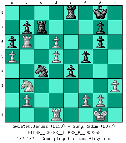Last move : 1/2-1/2 2023 April 23 8:55:24 [Event "FICGS__CHESS__CLASS_A__000265"] [Site "FICGS"] [Date "2023.02.05"] [Round "1"] [White "Swiatek,Janusz"] [Black "Sury,Radim"] [Result "1/2-1/2"] [WhiteElo "2199"] [BlackElo "2077"] 1.e4 c5 2.Nf3 d6 3.d4 cxd4 4.Nxd4 Nf6 5.Nc3 a6 6.Be2 e5 7.Nb3 Be7 8.Be3 Be6 9.Nd5 Nbd7 10.Qd3 O-O 11.a4 Bxd5 12.exd5 e4 13.Qd2 Ne5 14.O-O Rc8 15.c3 Qd7 16.a5 Rfe8 17.h3 Qf5 18.Rfd1 Nc4 19.Bxc4 Rxc4 20.Qe2 R4c8 21.c4 Nd7 22.Ra4 Qg6 23.Rb4 Rc7 24.Qg4 Ne5 25.Qxg6 hxg6 26.c5 f5 27.Bf4 Bf8 28.Rb6 Nc4 29.Bxd6 Bxd6 30.cxd6 1/2-1/2 Follow this game move after move (download)Chess is above all, a fight ! (Emanuel Lasker) Ich erzeugte keinen Neid, da mich die Schachspieler als Musiker und die Musiker als Schachspieler betrachteten. (Mark Taimanov) La batalla por la última verdad nunca sera ganada. Y es por eso que el Ajedrez es tan fascinante. (Hans Kmoch) Les Echecs ont trois composantes : le temps, l'espace et le matériel en dernier. (Mikhail Tal) Wipe them out. All of them. (Darth Sidious in Star Wars ep.1)
