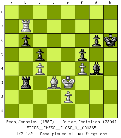 Last move : 1/2-1/2 2024 June 15 22:18:40 [Event "FICGS__CHESS__CLASS_A__000265"] [Site "FICGS"] [Date "2023.02.05"] [Round "1"] [White "Pech,Jaroslav"] [Black "Javier,Christian"] [Result "1/2-1/2"] [WhiteElo "1987"] [BlackElo "2204"] 1.c4 e5 2.Nc3 Bb4 3.Nd5 Be7 4.d4 exd4 5.Qxd4 Nf6 6.Nxe7 Qxe7 7.Bg5 Nc6 8.Qc3 d6 9.Nf3 Ne5 10.Nxe5 Qxe5 11.Qxe5+ dxe5 12.g3 Ne4 13.Be3 Nd6 14.Rc1 Nf5 15.Bc5 b6 16.Bg2 Rb8 17.Ba3 a5 18.Bc6+ Bd7 19.Bd5 c6 20.Be4 c5 21.b3 Ne7 22.Bb2 f6 23.O-O Rd8 24.Rfd1 Bf5 25.Bg2 Kf7 26.f4 e4 27.h3 h5 28.Kf2 Nc6 29.Bc3 Nb4 30.Bxb4 axb4 31.Rxd8 Rxd8 32.Ra1 Rd2 33.a3 bxa3 34.Rxa3 Rb2 35.Ra7+ Kg6 36.Rb7 Rxb3 37.g4 hxg4 38.hxg4 Bxg4 39.Bxe4+ Kh6 40.Rf7 Rb2 41.Bd3 f5 42.Re7 Kg6 43.Rc7 Kf6 44.Rc6+ Kf7 45.Rc7+ Kf6 46.Rc6+ Kf7 47.Rc7+ Kg6 48.Rc6+ Kh7 49.Rc7 Kh6 50.Rf7 Kh7 51.Rc7 Kg6 52.Rc6+ Kh5 53.Rc7 Kh6 54.Rf7 Rb4 55.Rb7 g6 56.Rc7 Bh5 57.Ke3 Bg4 58.Rd7 Rb3 59.Rb7 Bh5 60.Rc7 Bg4 61.Rb7 Bh5 62.Rc7 Rb4 63.Rd7 Rb2 64.Rf7 Ra2 65.Rb7 Rb2 66.Rd7 Bg4 67.Rc7 Ra2 68.Rd7 Rb2 69.Re7 Rb4 70.Rd7 Bh3 71.Kf3 Rb3 72.Rb7 Rb2 73.Rc7 Ra2 74.Rb7 Rb2 75.Rc7 Rb3 76.Rb7 Bg4+ 77.Ke3 1/2-1/2 Follow this game move after move (download)Chess makes man wiser and clear-sighted. (Vladimir Putin) Ich spiele 70 Eröffnungssysteme. (Viktor Kortschnoi) Aún deseo matar a Fischer. (Boris Spassky) Même si l'adversaire joue le coup analysé précédemment, recommencez l'analyse en voyant la nouvelle position. Première règle de Blumenfeld A cynic is a man who knows the price of everything but the value of nothing. (Oscar Wilde)