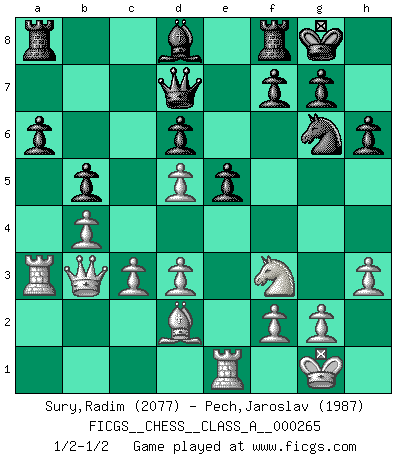 Last move : 1/2-1/2 2023 July 15 23:52:28 [Event "FICGS__CHESS__CLASS_A__000265"] [Site "FICGS"] [Date "2023.02.05"] [Round "1"] [White "Sury,Radim"] [Black "Pech,Jaroslav"] [Result "1/2-1/2"] [WhiteElo "2077"] [BlackElo "1987"] 1.e4 e5 2.Nf3 Nc6 3.Bb5 a6 4.Ba4 Nf6 5.O-O Be7 6.Re1 b5 7.Bb3 O-O 8.h3 Bb7 9.d3 d6 10.a3 Na5 11.Ba2 c5 12.Nbd2 Nc6 13.Nf1 Bc8 14.Ne3 Be6 15.Bd5 Qd7 16.c3 Bd8 17.b4 cxb4 18.axb4 Bxd5 19.Nxd5 Nxd5 20.exd5 Ne7 21.Qb3 h6 22.Bd2 Ng6 23.Ra3 1/2-1/2 Follow this game move after move (download)Man is a frivolous, a specious creature, and like a Chess player, cares more for the process of attaining his goal than for the goal itself. (Dostoyevsky) Fischer ist das größte Genie, das je vom Schachhimmel heruntergestiegen ist. (Mikhail Nekhemyevich Tal) Si un gobernante no entiende al Ajedrez, ¿como puede governar él un reinado?. (El Rey Khusros II) En blitz, le Cavalier l'emporte sur le Fou. (Vlastimil Hort) Pushing plastic is for the many, pushing virtual pieces is for the fewer, pushing wood is for the very few. (Normajean Yates)