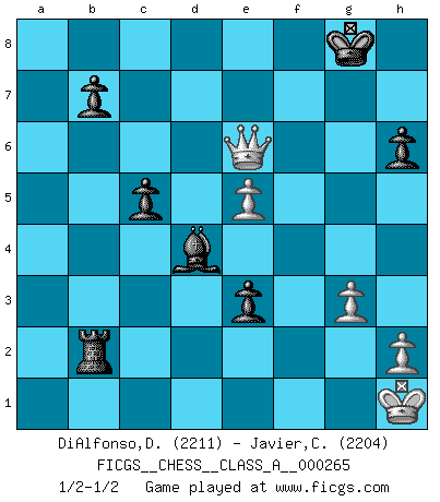 Last move : 1/2-1/2 2023 June 19 6:10:32 [Event "FICGS__CHESS__CLASS_A__000265"] [Site "FICGS"] [Date "2023.02.05"] [Round "1"] [White "DiAlfonso,Darren"] [Black "Javier,Christian"] [Result "1/2-1/2"] [WhiteElo "2211"] [BlackElo "2204"] 1.d4 Nf6 2.c4 e6 3.Nf3 d5 4.Nc3 Bb4 5.Qa4+ Nc6 6.e3 O-O 7.Qc2 Re8 8.Bd2 h6 9.a3 Bf8 10.cxd5 exd5 11.Bd3 Bd6 12.O-O Bd7 13.Rfe1 Bg4 14.Nh4 Ne4 15.g3 Nxd2 16.Qxd2 Bf8 17.Rac1 Ne7 18.f3 Be6 19.f4 c6 20.f5 Bd7 21.f6 Nc8 22.fxg7 Bxg7 23.Ne2 Bf6 24.Ng2 Nd6 25.Nef4 Bg5 26.Rf1 Bg4 27.a4 Qd7 28.b4 a6 29.Bb1 Ne4 30.Qb2 a5 31.bxa5 Rxa5 32.Nd3 Rxa4 33.Ne5 Rxe5 34.dxe5 Qe7 35.Bc2 Rb4 36.Qa1 Bh3 37.Bd3 Nd2 38.Rf2 Bxg2 39.Kxg2 Bxe3 40.Rf5 Bd4 41.Qa5 Rb2 42.Kh1 c5 43.Re1 Ne4 44.Bxe4 dxe4 45.Ref1 e3 46.Rxf7 Qxf7 47.Qd8+ Kg7 48.Rxf7+ Kxf7 49.Qd7+ Kg8 50.Qe6+ 1/2-1/2 Follow this game move after move (download)A Chess game is divided into three stages: the first, when you hope you have the advantage, the second when you believe you have an advantage, and the third... when you know you're going to lose ! (Savielly Tartakower) Ich las kürzlich ein Buch von Nietzsche. Er sagte Religion verdumme nur die Menschen. Ich stimme zu. (Robert James Fischer) El Ajedrez es la vida. (Bobby Fischer) Avec des compensations pour le matériel en plus... (Anonyme) We need strong personalities and only one world champion to attract sponsors. (Anatoly Karpov)