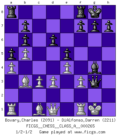 Last move : 1/2-1/2 2023 February 13 18:24:18 [Event "FICGS__CHESS__CLASS_A__000265"] [Site "FICGS"] [Date "2023.02.05"] [Round "1"] [White "Bovary,Charles"] [Black "DiAlfonso,Darren"] [Result "1/2-1/2"] [WhiteElo "2091"] [BlackElo "2211"] 1.e4 e5 2.Nf3 Nc6 3.Bc4 Bc5 4.c3 Nf6 5.d3 d6 6.O-O O-O 7.b4 Bb6 8.a4 a5 9.b5 Ne7 10.Nbd2 Ng6 11.Bb3 Bg4 12.h3 Bh5 13.Nc4 Nh4 14.Nxb6 cxb6 15.g4 Nxg4 16.Nxh4 Qxh4 17.hxg4 Bxg4 18.f3 Qg3+ 19.Kh1 Qh4+ 20.Kg1 Qg3+ 1/2-1/2 Follow this game move after move (download)A thorough understanding of the typical mating continuations makes the most complicated sacrificial combinations leading up to them not only not difficult, but almost a matter of course. (Siegbert Tarrasch) Ein Schachspiel besteht aus drei Phasen: Die erste, wenn du hofftst den Vorteil zu haben, die zweite, wenn du glaubst einen Vorteil zu haben, und die dritte.... wenn du weißt Du wirst verlieren. (Savielly Grigorievitsch Tartakower) La caracteristica mas importante en la posición del Ajedrez es la actividad de las piezas. Esto es absolutamente fundamental en todas las fases del juego: Apertura, Juego Medio y especialmente Finales. La limitación primordial en la actividad de una pieza, es la estructuración de los Peones. (Michael Stean) On peut tirer plus d'utilité d'une partie perdue que de 100 parties gagnées. (Capablanca) Creativity is inventing, experimenting, growing, taking risks, breaking rules, making mistakes, and having fun. (Mary Lou Cook)