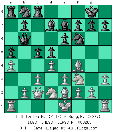 Last move : 0-1 2023 May 17 1:25:24 [Event "FICGS__CHESS__CLASS_A__000265"] [Site "FICGS"] [Date "2023.02.05"] [Round "1"] [White "D Oliveira,Marcos Arruda"] [Black "Sury,Radim"] [Result "0-1"] [WhiteElo "2116"] [BlackElo "2077"] 1.d4 Nf6 2.Nc3 d5 3.Bf4 e6 4.Nb5 Na6 5.e3 Bb4+ 6.c3 Be7 7.a4 c6 8.Na3 Qb6 9.Qc2 O-O 10.Nf3 Bd7 11.Nb1 c5 12.Be2 Rfc8 13.Nbd2 Nb8 14.h3 a5 0-1 This chess game has been lost on time (started : 2023.02.05 16:21:56) Follow this game move after move (download)It began to feel as though you were playing against Chess itself. - On playing against Robert Fischer. (Walter Shipman) Das Zentrum ist der Balkan des Schachbretts - Kriegshandlungen können in jedem Moment ausbrechen. (Aaron Nimzowitsch) Debes de llevar a tu oponente hacia un profundo y obscuro bosque donde 2+2=5, y el camino que conduce a la salida es suficientemente ancho para solamente uno. (Mikhail Tal) Le moment que je préfère le plus dans une rencontre, c'est celui où je sens que la personnalité de l'adversaire se brise. (Robert Fischer) I fear not the man who has practiced 10,000 kicks once, but I fear the man who has practiced one kick 10,000 times. (Bruce Lee)