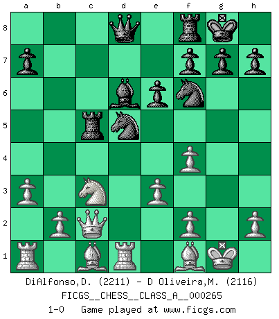 Last move : 1-0 2023 May 15 0:10:45 [Event "FICGS__CHESS__CLASS_A__000265"] [Site "FICGS"] [Date "2023.02.05"] [Round "1"] [White "DiAlfonso,Darren"] [Black "D Oliveira,Marcos Arruda"] [Result "1-0"] [WhiteElo "2211"] [BlackElo "2116"] 1.d4 Nf6 2.c4 e6 3.Nf3 d5 4.Nc3 c6 5.e3 Nbd7 6.Qc2 Bd6 7.Bd3 O-O 8.O-O dxc4 9.Bxc4 b5 10.Bd3 Bb7 11.a3 Rc8 12.Rd1 c5 13.Bxb5 Bxf3 14.gxf3 Nd5 15.f4 cxd4 16.Rxd4 N7f6 17.Rd1 Rc5 18.Bf1 1-0 This chess game has been lost on time (started : 2023.02.05 16:21:56) Follow this game move after move (download)Many have become Chess Masters, no one has become the Master of Chess. (Siegbert Tarrasch) Stelle das Brett so, daß die Sonne in die Augen deines Gegners scheint. (Ruy López) Nunca antes ha habido un jugador de Ajedrez con tal conocimiento a fondo de las complejidades del juego y una inmensa voluntad absolutamente indomable de ganar. Yo pienso que Fischer es el jugador mas grande que jamás haya existido. (Lisa Lane) Des points faibles ou des trous dans la position de l'adversaire doivent être occupés par des pièces et non pas par des pions. (Siegbert Tarrasch) All politicians must be presumed guilty until they are proven innocent. (Dinesh De Silva)