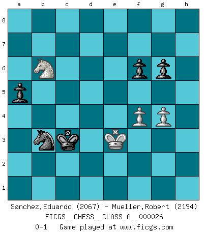 Last move : 0-1 2008 August 8 16:19:23 [Event "FICGS__CHESS__CLASS_A__000026"] [Site "FICGS"] [Date "2007.08.23"] [Round "1"] [White "Sanchez,Eduardo"] [Black "Mueller,Robert"] [Result "0-1"] [WhiteElo "2067"] [BlackElo "2194"] 1.d4 Nf6 2.Nf3 e6 3.c4 b6 4.a3 Bb7 5.Nc3 d5 6.cxd5 Nxd5 7.e3 Be7 8.Bb5+ c6 9.Bd3 Nxc3 10.bxc3 c5 11.O-O Nc6 12.e4 O-O 13.d5 Na5 14.c4 b5 15.Rb1 bxc4 16.Bxc4 Nxc4 17.Rxb7 exd5 18.Qxd5 Qxd5 19.exd5 Rfe8 20.Bf4 Rad8 21.Rd1 a6 22.Kf1 f6 23.h4 Bf8 24.Rd3 Re4 25.Rb8 Rxb8 26.Bxb8 Nb6 27.d6 Nd7 28.Bc7 Kf7 29.h5 Ke6 30.g3 g5 31.hxg6 hxg6 32.Nd2 Rd4 33.Re3+ Kd5 34.Nf3 Re4 35.Rd3+ Kc6 36.Nd2 Rd4 37.Rxd4 cxd4 38.Nb3 Bxd6 39.Bxd6 Kxd6 40.Nxd4 Kd5 41.Nb3 Kc4 42.Nd2+ Kd3 43.Nb3 Kc3 44.Na5 Kb2 45.f4 Nc5 46.Ke2 Kxa3 47.g4 Kb2 48.Ke3 Nb3 49.Nc4+ Kc3 50.Nb6 a5 0-1 Queen's pawn game Kingside Castling by player White (move 11) Kingside Castling by player Black (move 12) 10 pieces endgame at move 40 : White KNPPP , Black KNPPP WHITE : King + 1 Knight 3 Pawns BLACK : King + 1 Knight 3 Pawns 9 pieces endgame at move 46 : White KNPP , Black KNPPP WHITE : King + 1 Knight 2 Pawns BLACK : King + 1 Knight 3 Pawns Player Black won this chess game. Follow this game move after move (download)That's what Chess is all about. One day you give your opponent a lesson, the next day he gives you one. (Bobby Fischer) Jede Eröffnung ist gut genug um gespielt zu werden, wenn nur ihr Ruf schlecht genug ist. (Savielly Grigorievitsch Tartakower) Del Ajedrez se ha dicho que la vida no es lo suficientemente larga para él, pero eso es culpa de la vida, no del Ajedrez. (William Ewart Napier) Un journaliste : 'Vous préférez avoir une dame de plus sur l'échiquier ou au lit ?' Boris Spassky : 'Ca dépend de la position.' There are two types of people in this world, good and bad. The good sleep better, but the bad seem to enjoy the waking hours much more. (Woody Allen)